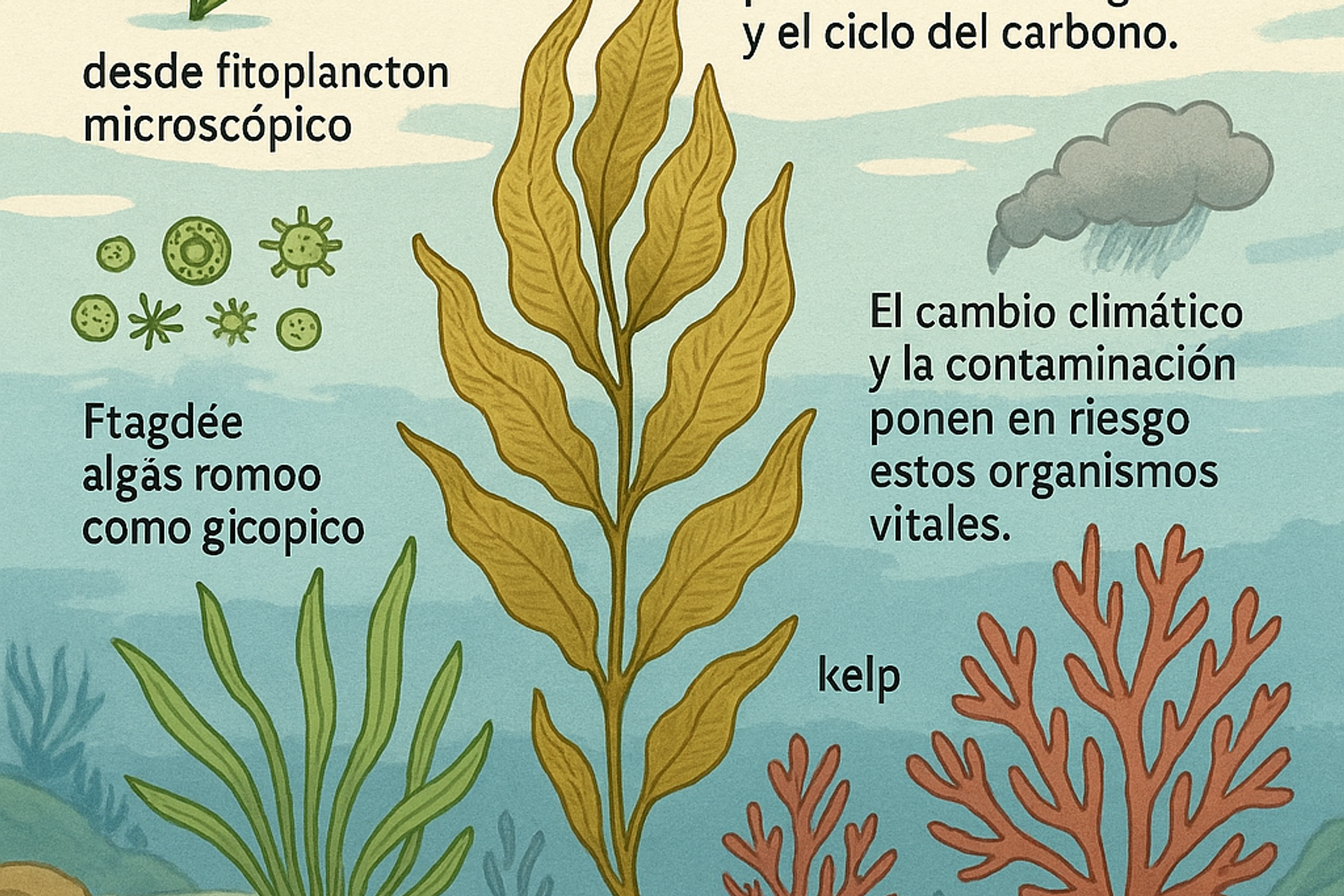 - Incluye desde fitoplancton microscópico hasta grandes algas marinas como el kelp.