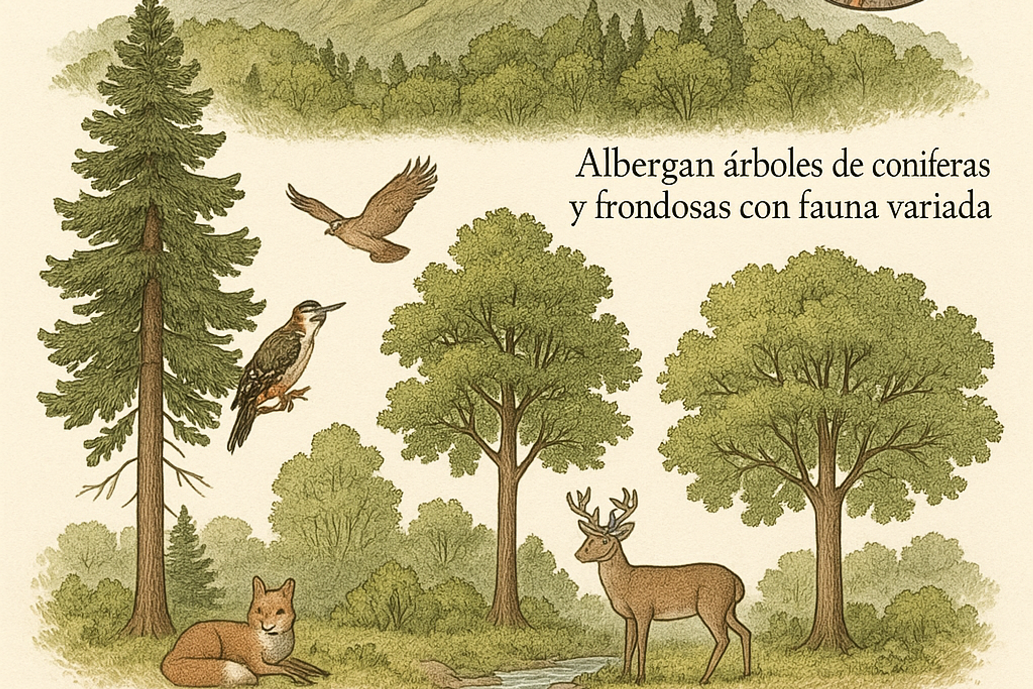 - Albergan árboles de coníferas y frondosas con fauna variada.