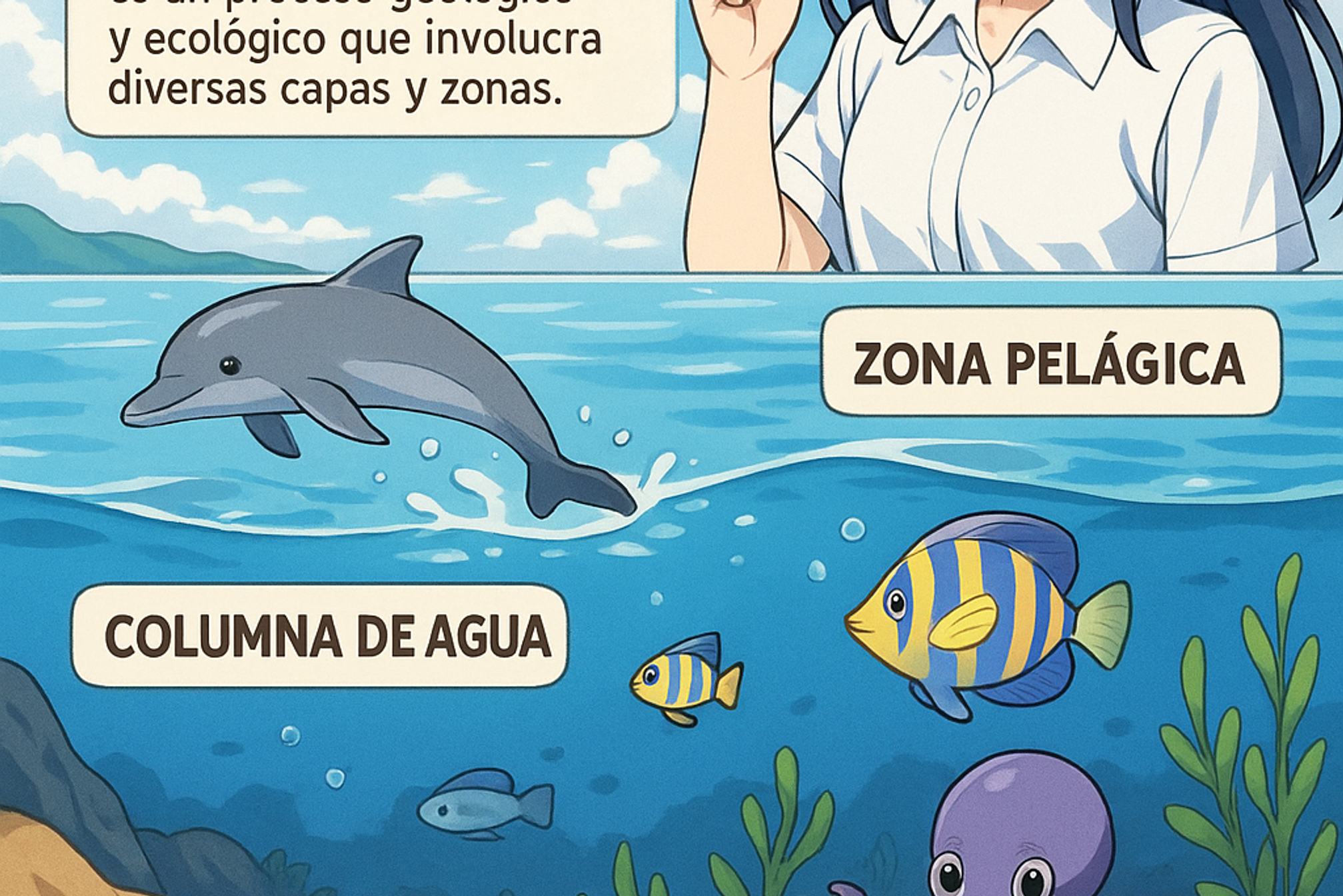La columna de agua se extiende desde la superficie hasta el fondo marino y es el espacio donde ocurren la mayoría de los procesos biológicos y físicos del océano. Este componente se divide en zonas según la luz y la profundidad (epipelágica, mesopelágica, batipelágica, abisopelágica), influenciando la distribución de organismos, la fotosíntesis y el movimiento de nutrientes. Es el cuerpo dinámico del océano, donde confluyen la química, la vida y la energía.