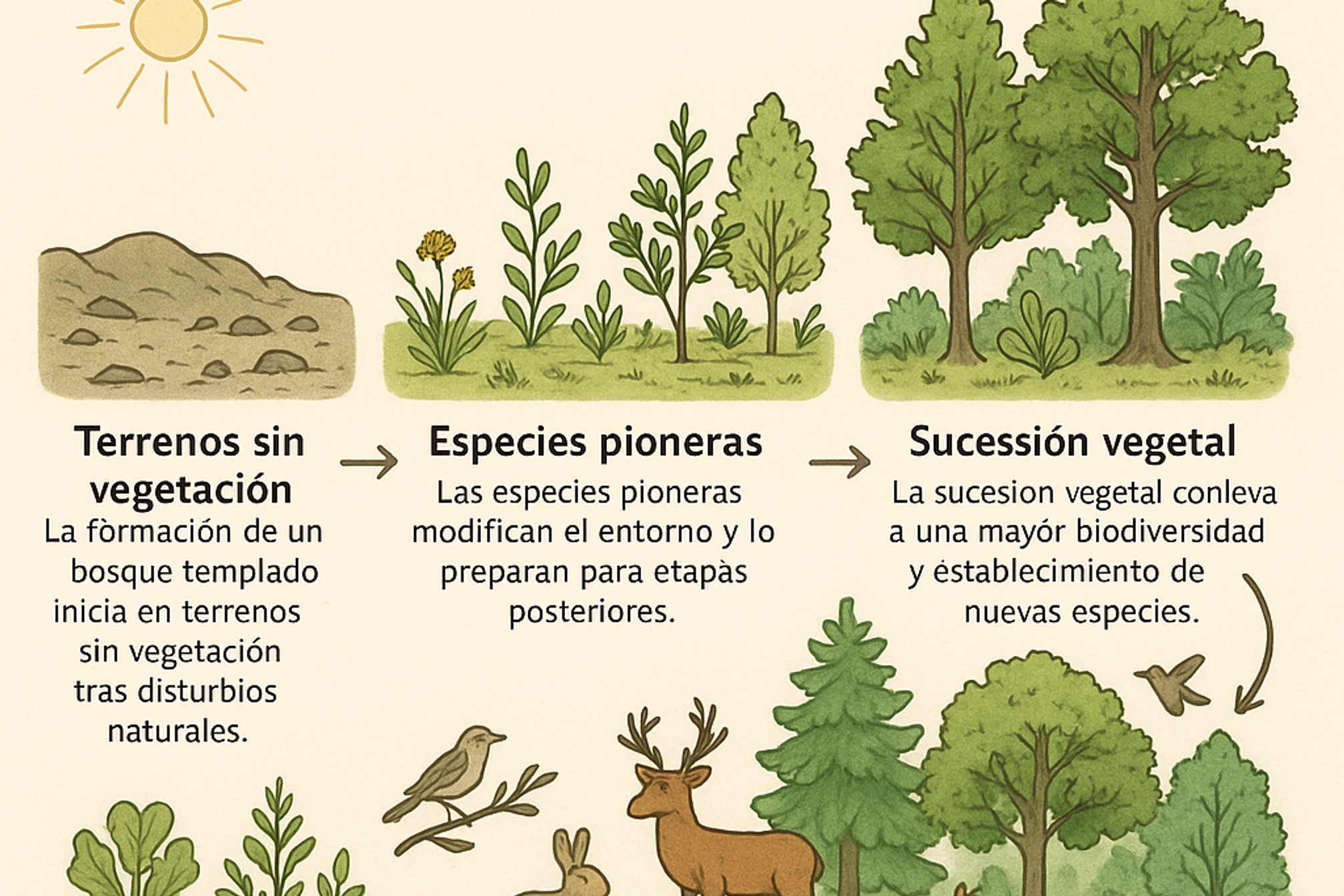 - La formación de un bosque templado inicia en terrenos sin vegetación tras disturbios naturales.