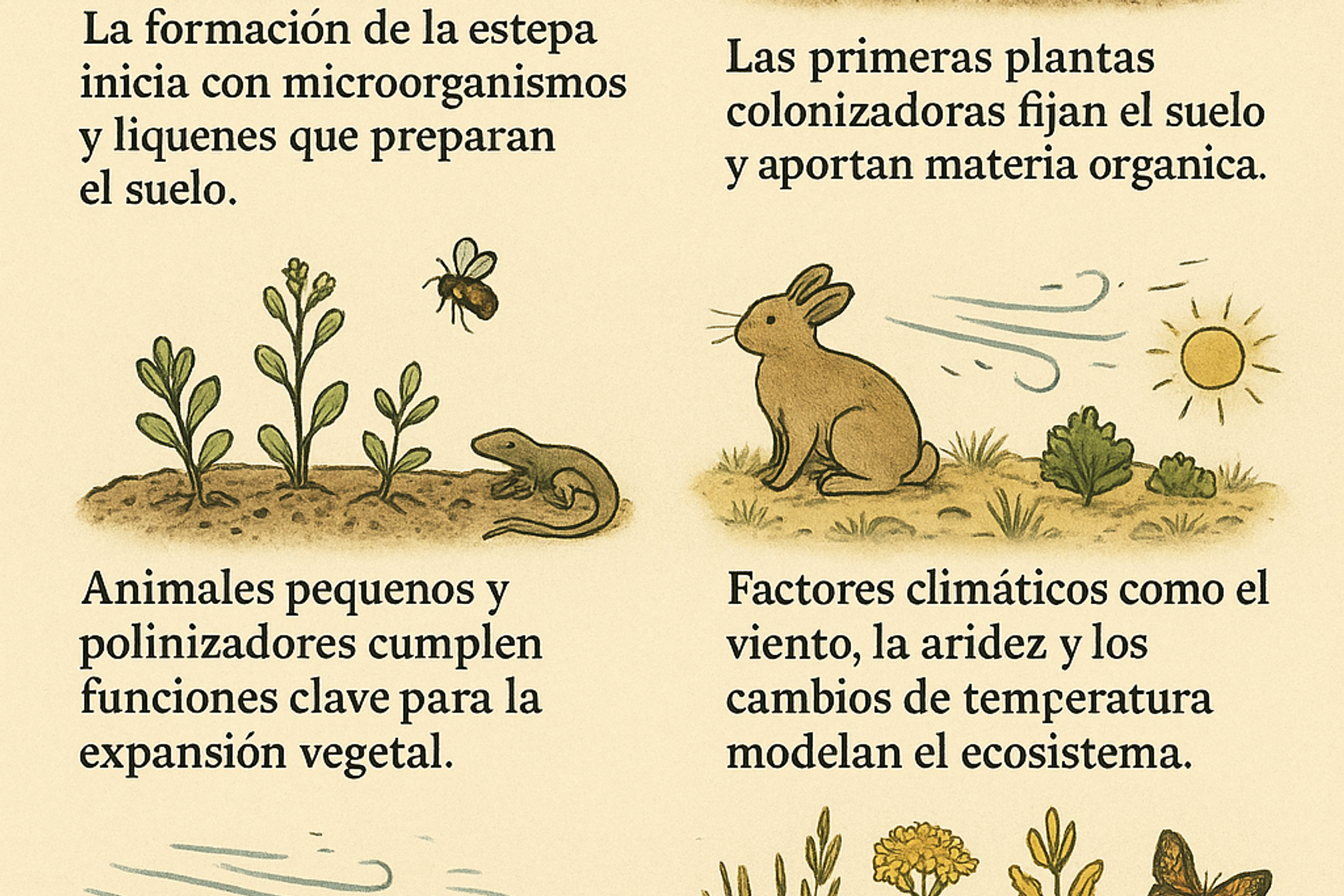 La formación de un ecosistema de estepa es un proceso complejo y fascinante donde intervienen numerosos elementos: desde los más diminutos microorganismos y líquenes que inician la construcción del suelo, pasando por plantas pioneras y gramíneas, hasta animales de múltiples tamaños y capacidades.