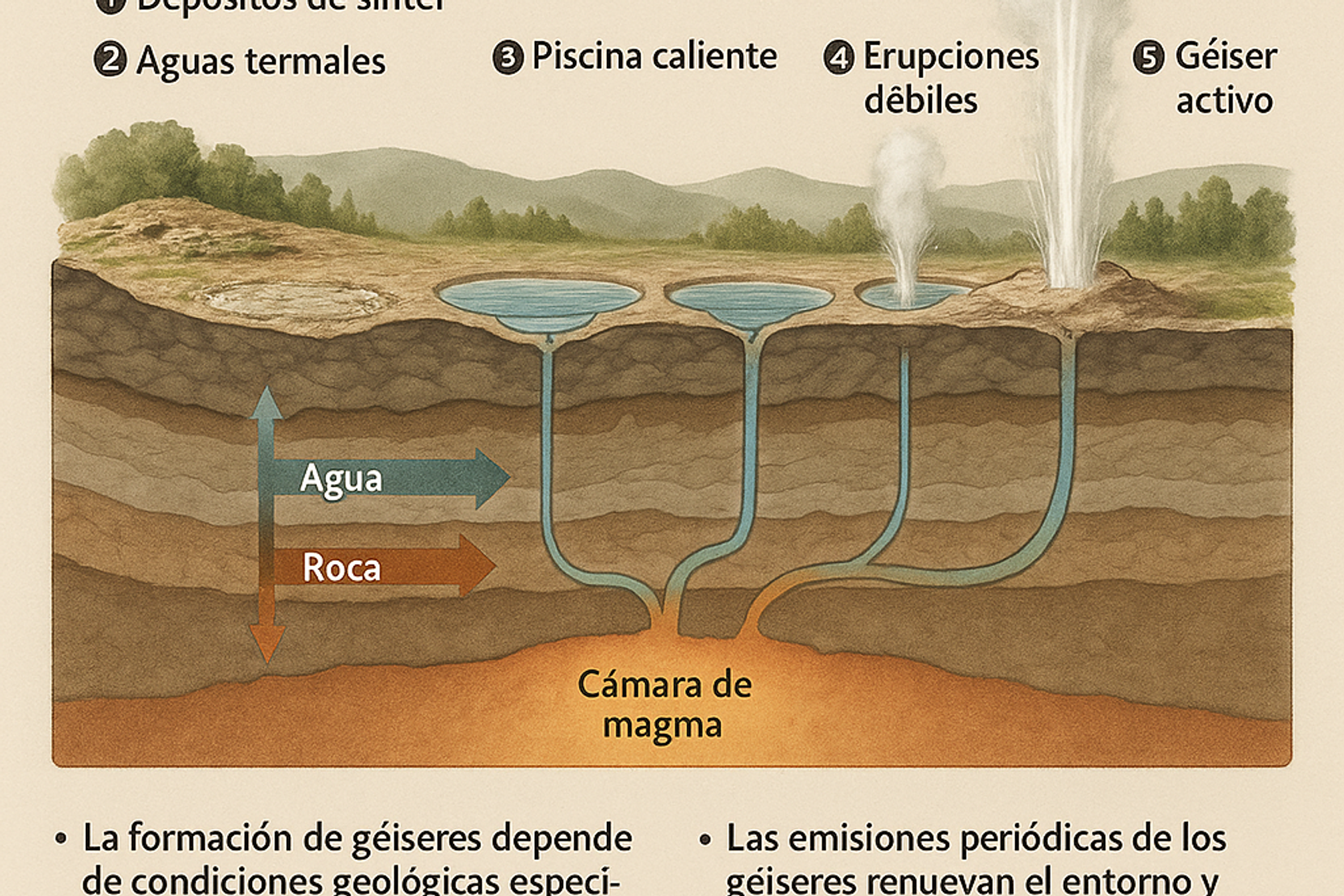 - La erupción limpia y redefine el canal, garantizando el funcionamiento cíclico del géiser.
