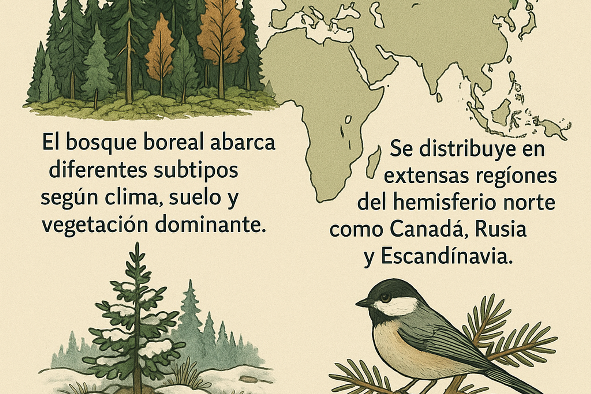 - El bosque boreal abarca diferentes subtipos según clima, suelo y vegetación dominante.