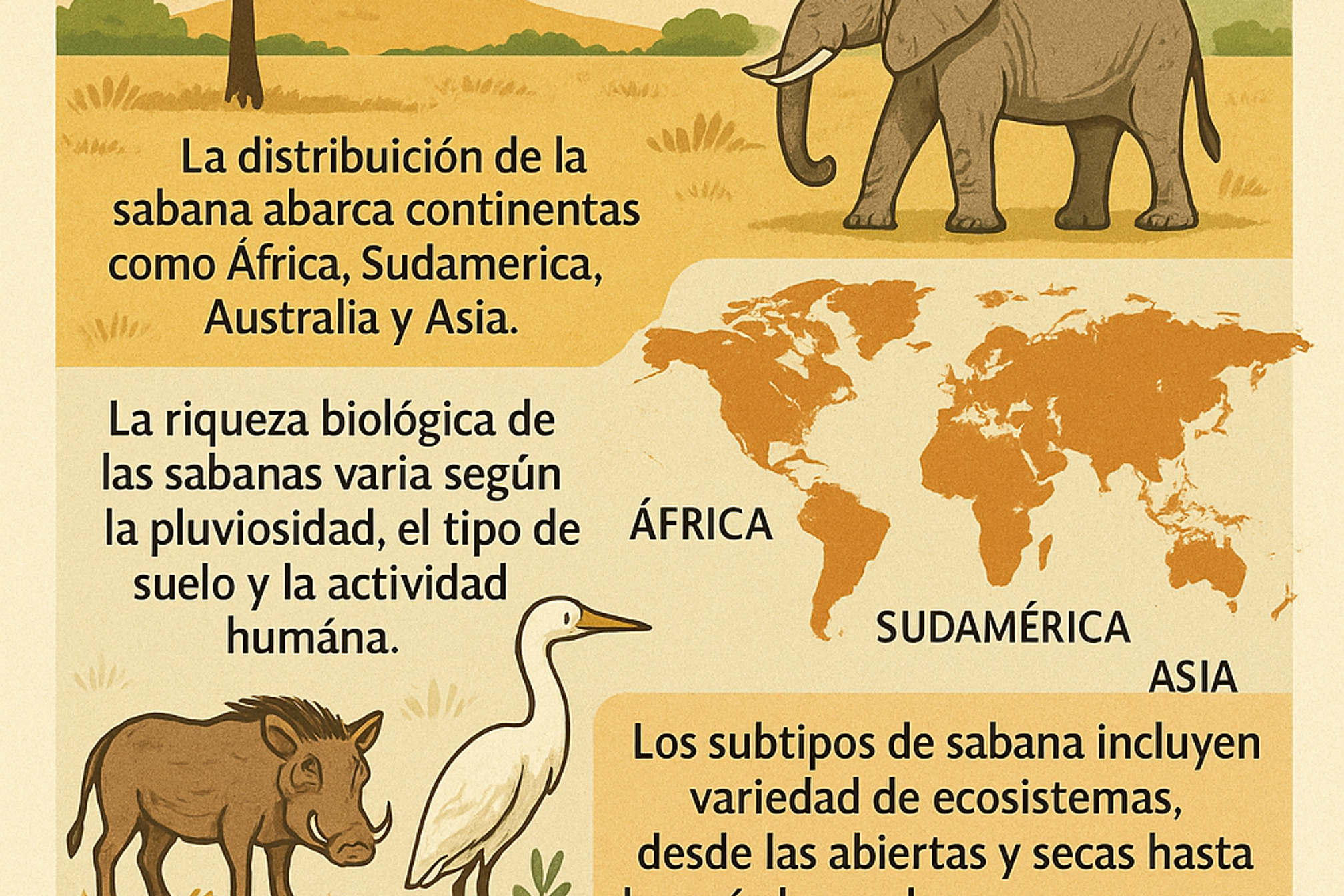 - Existen varios subtipos de sabana, cada uno adaptado a condiciones climáticas y geográficas específicas.