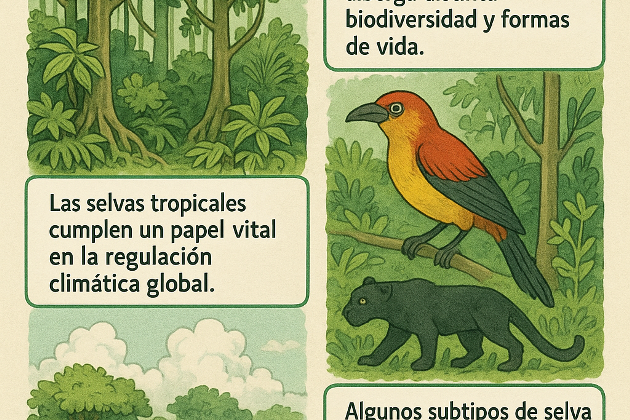 - Cada tipo de selva tropical alberga distinta biodiversidad y formas de vida.