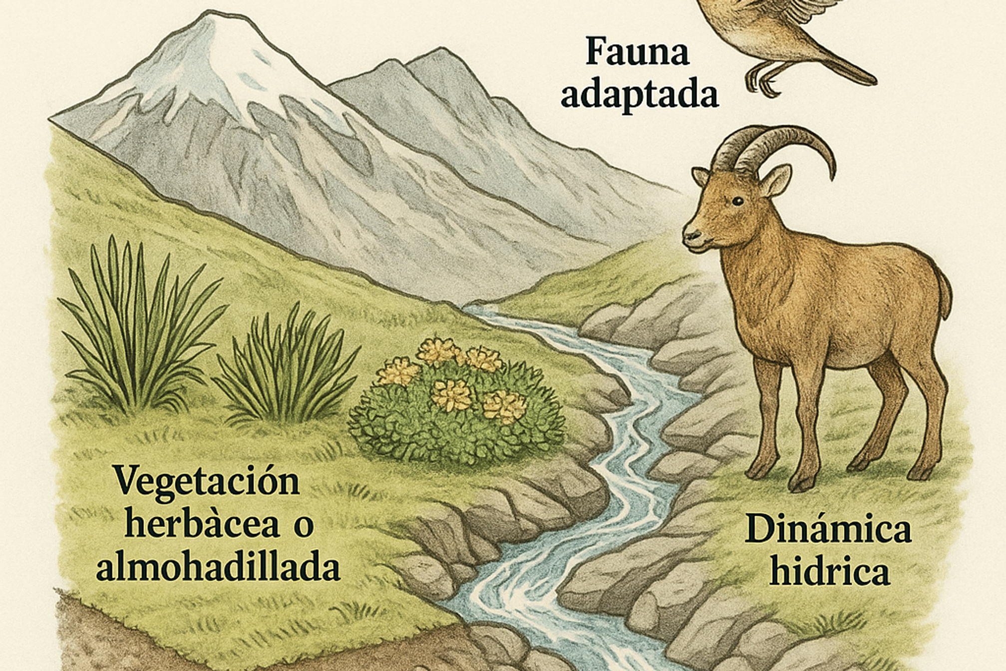 - Incluye el suelo alpino, vegetación herbácea o almohadillada, una fauna adaptada y dinámica hídrica particular.