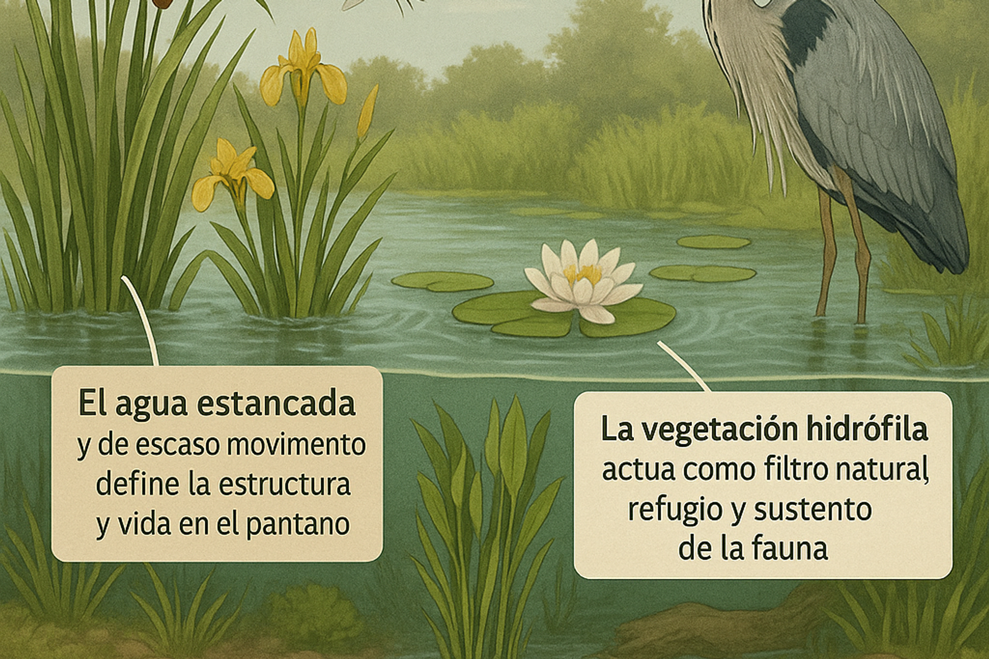 - El agua estancada y de escaso movimiento define la estructura y vida en el pantano.