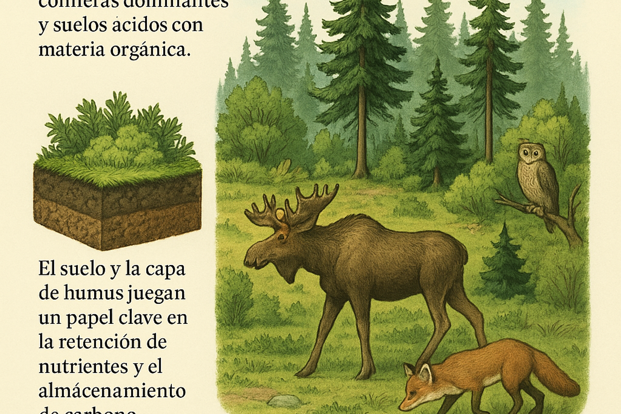 El suelo en los bosques boreales es generalmente ácido, pobre en nutrientes y posee un contenido significativo de materia orgánica en descomposición, conocida como capa de humus.