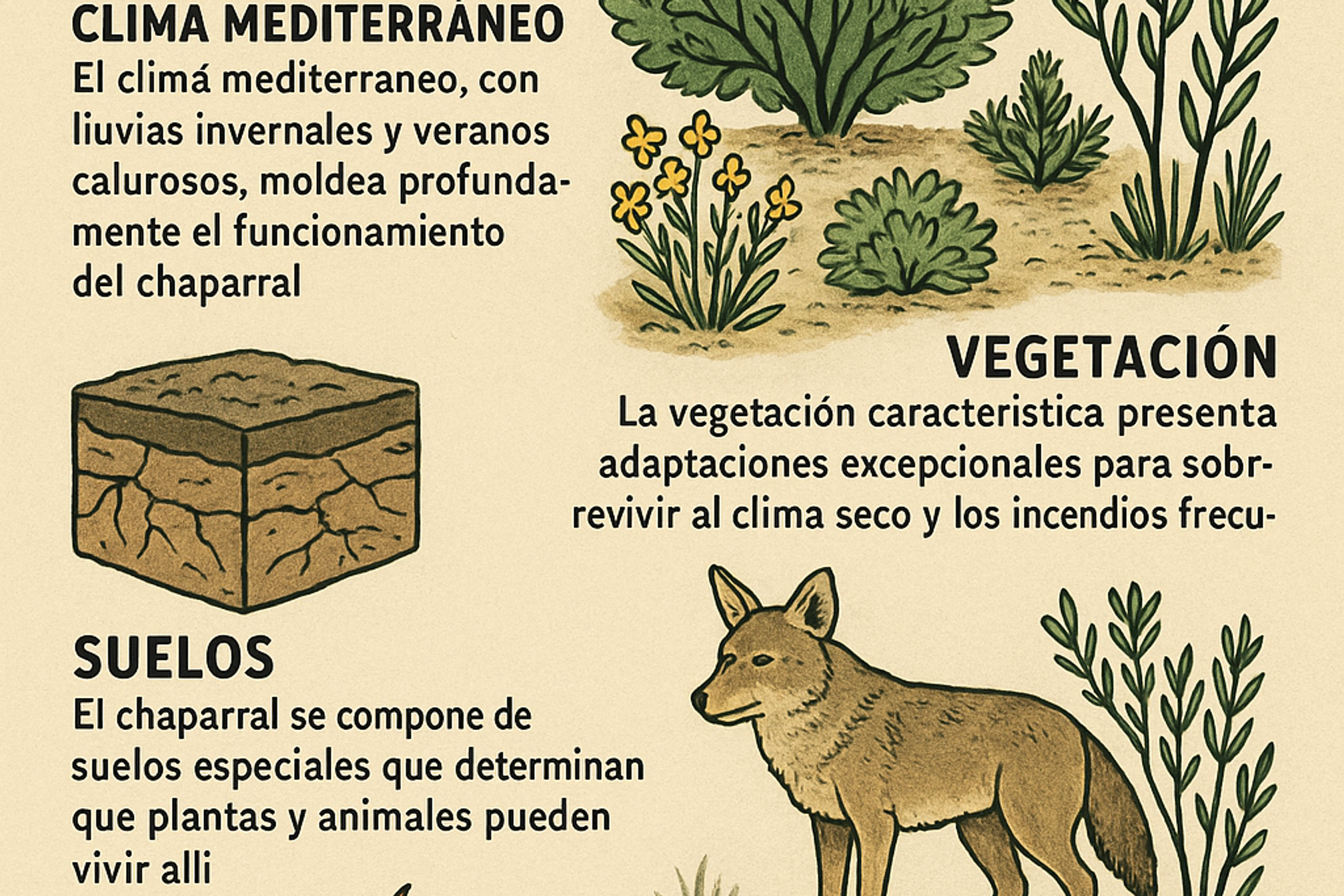 - El clima mediterráneo, con lluvias invernales y veranos calurosos, moldea profundamente el funcionamiento del chaparral.