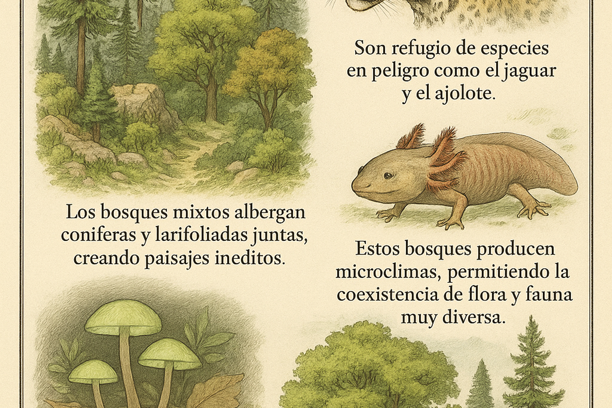 - Los bosques mixtos albergan coníferas y latifoliadas juntas, creando paisajes inéditos.