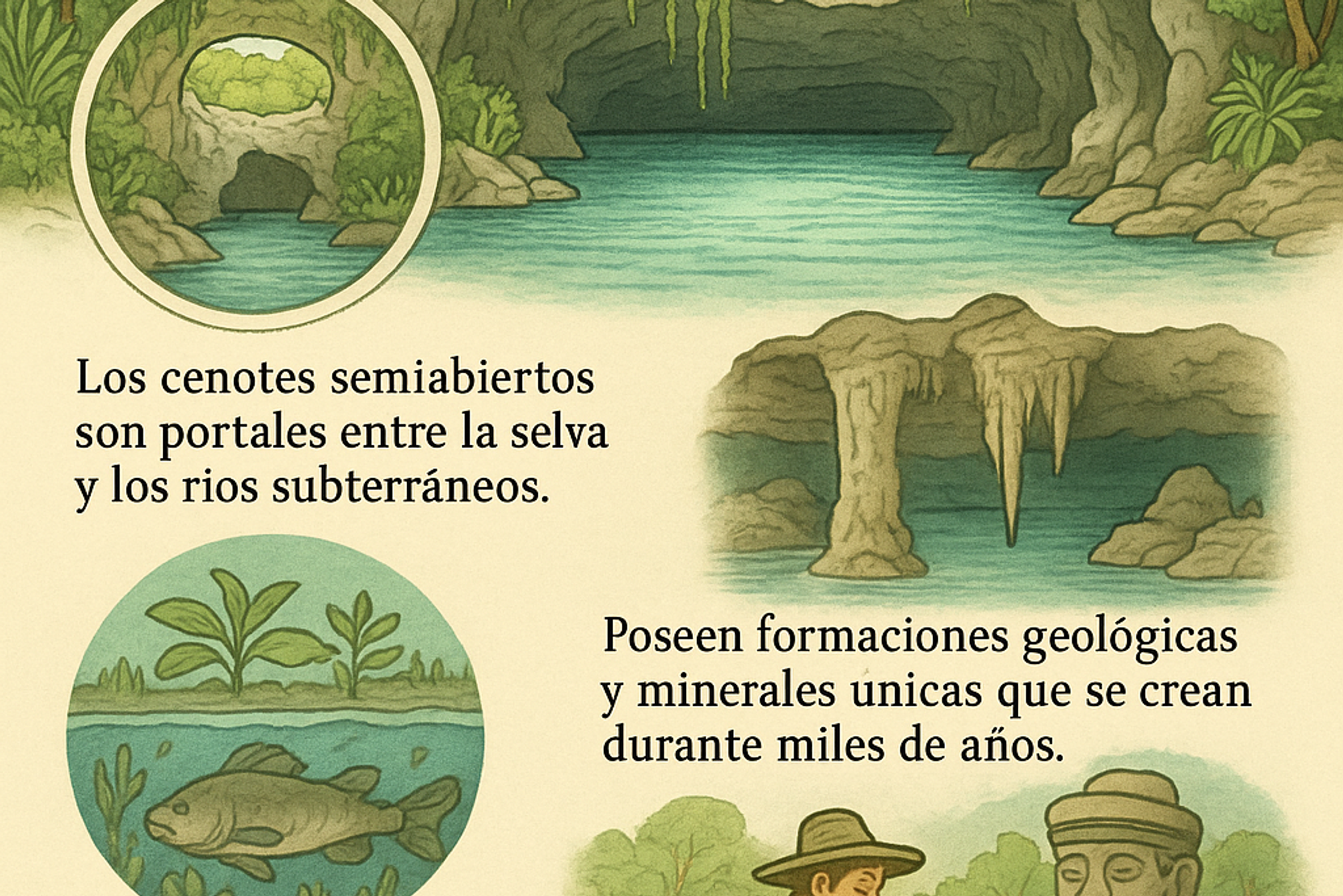 - Los cenotes semiabiertos son portales entre la selva y los ríos subterráneos.