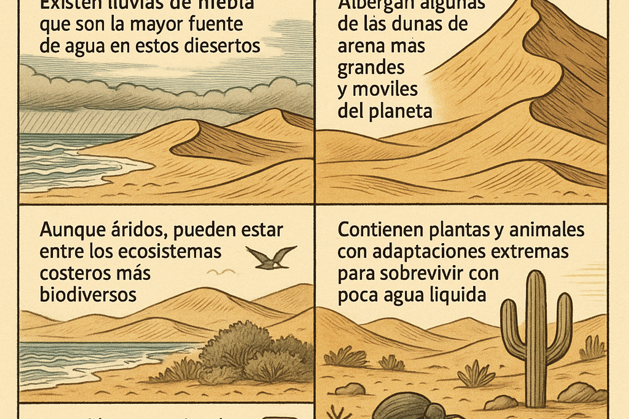 Los desiertos costeros, a pesar de estar a orillas de océanos, esconden fenómenos meteorológicos y geográficos sorprendentes. Descubre datos curiosos sobre estos ecosistemas únicos donde la niebla, las dunas móviles y la biodiversidad adaptada revelan lo extraordinario de la vida junto al mar.