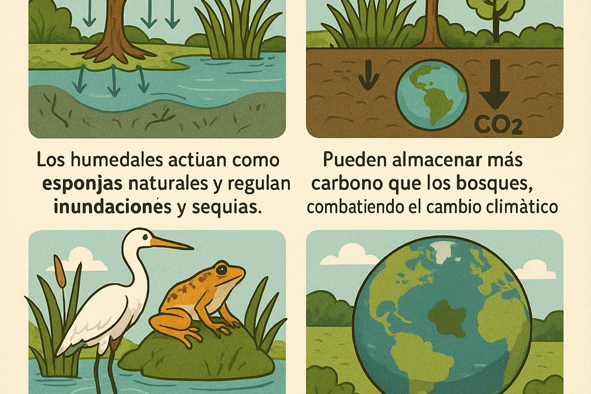 - Los humedales actúan como esponjas naturales y regulan inundaciones y sequías.