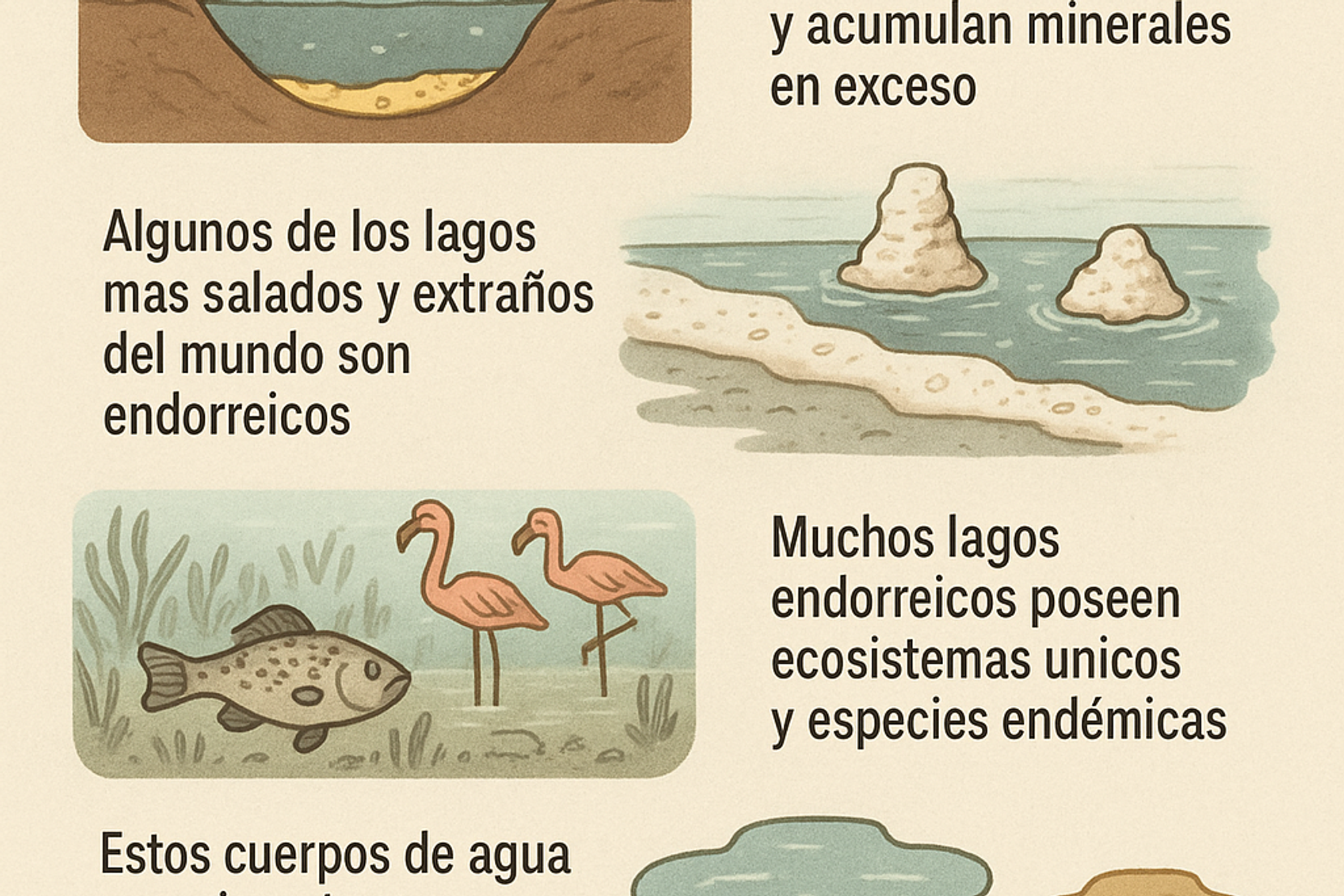 - Los lagos endorreicos no tienen salida al mar y acumulan minerales en exceso.