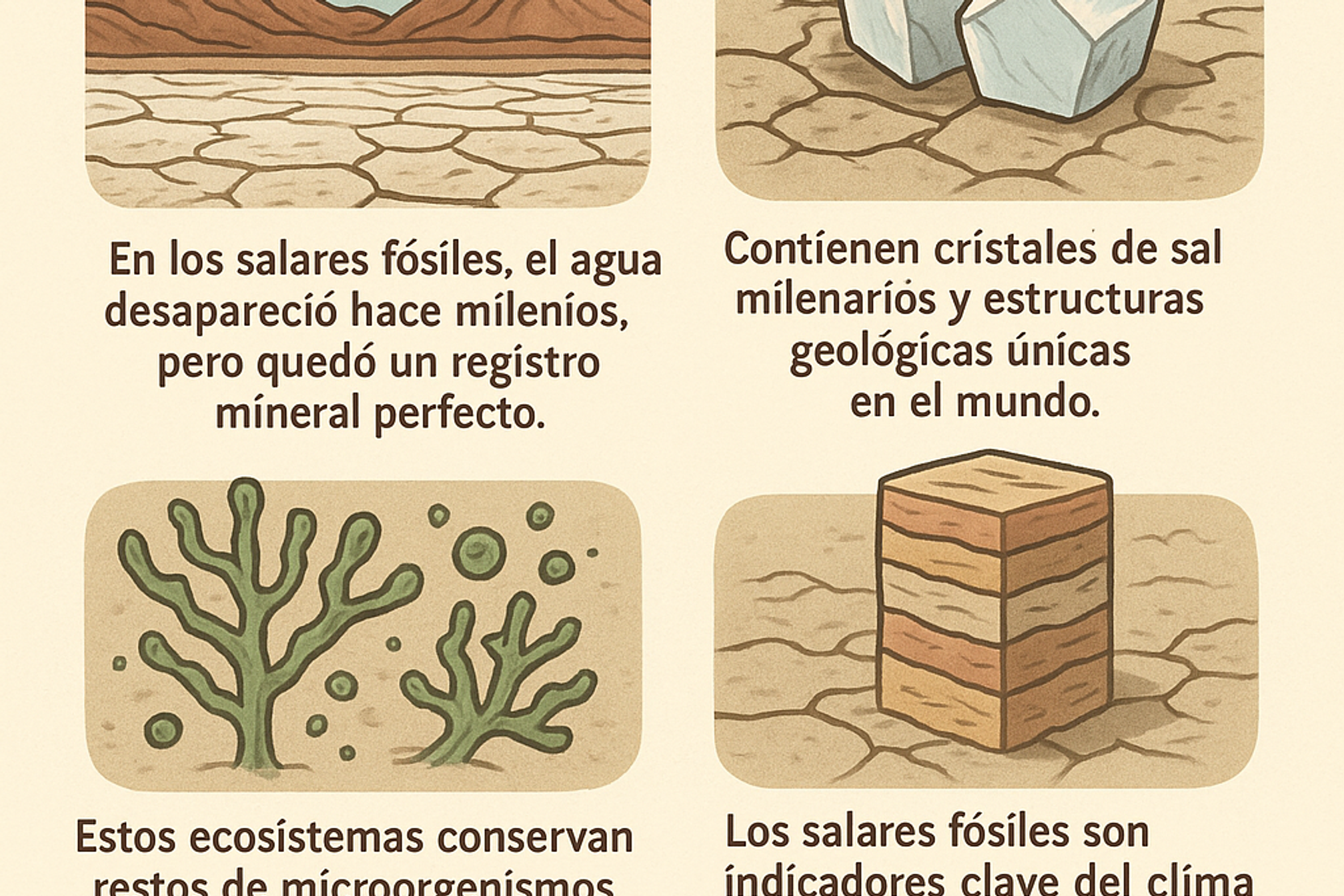 - Los salares fósiles son indicadores clave del clima y la historia geológica terrestre.