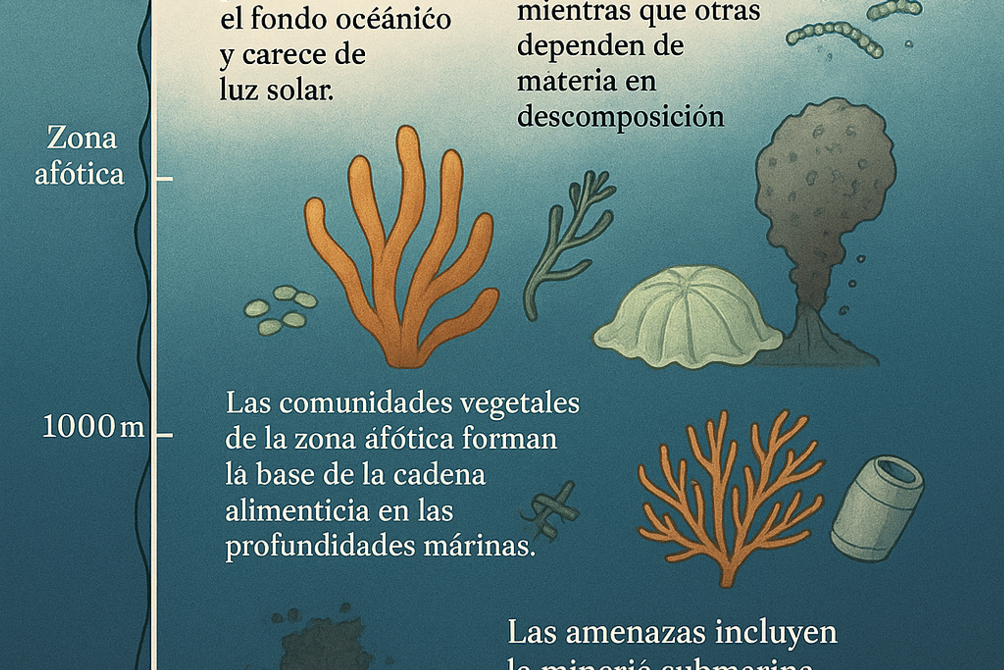 - Las comunidades vegetales de la zona afótica forman la base de la cadena alimenticia en las profundidades marinas.