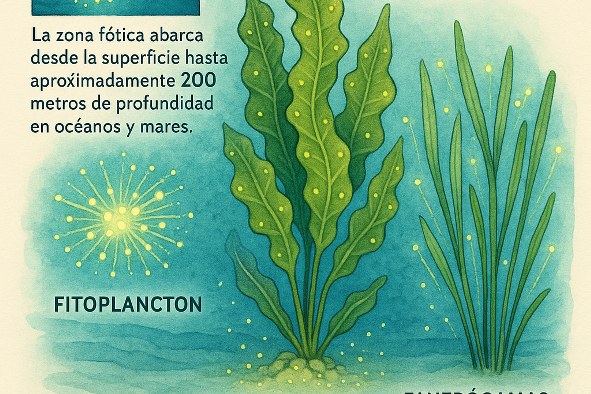 - La zona fótica abarca desde la superficie hasta aproximadamente 200 metros de profundidad en océanos y mares.