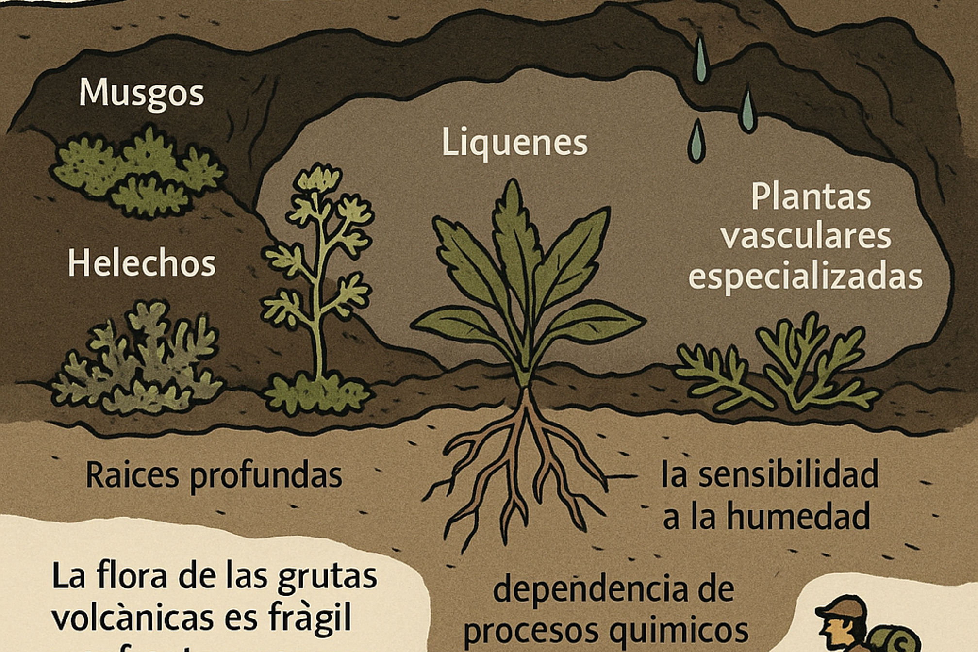 - Las grutas volcánicas albergan flora altamente adaptada a la oscuridad, escasez de recursos y suelos pobres en nutrientes.