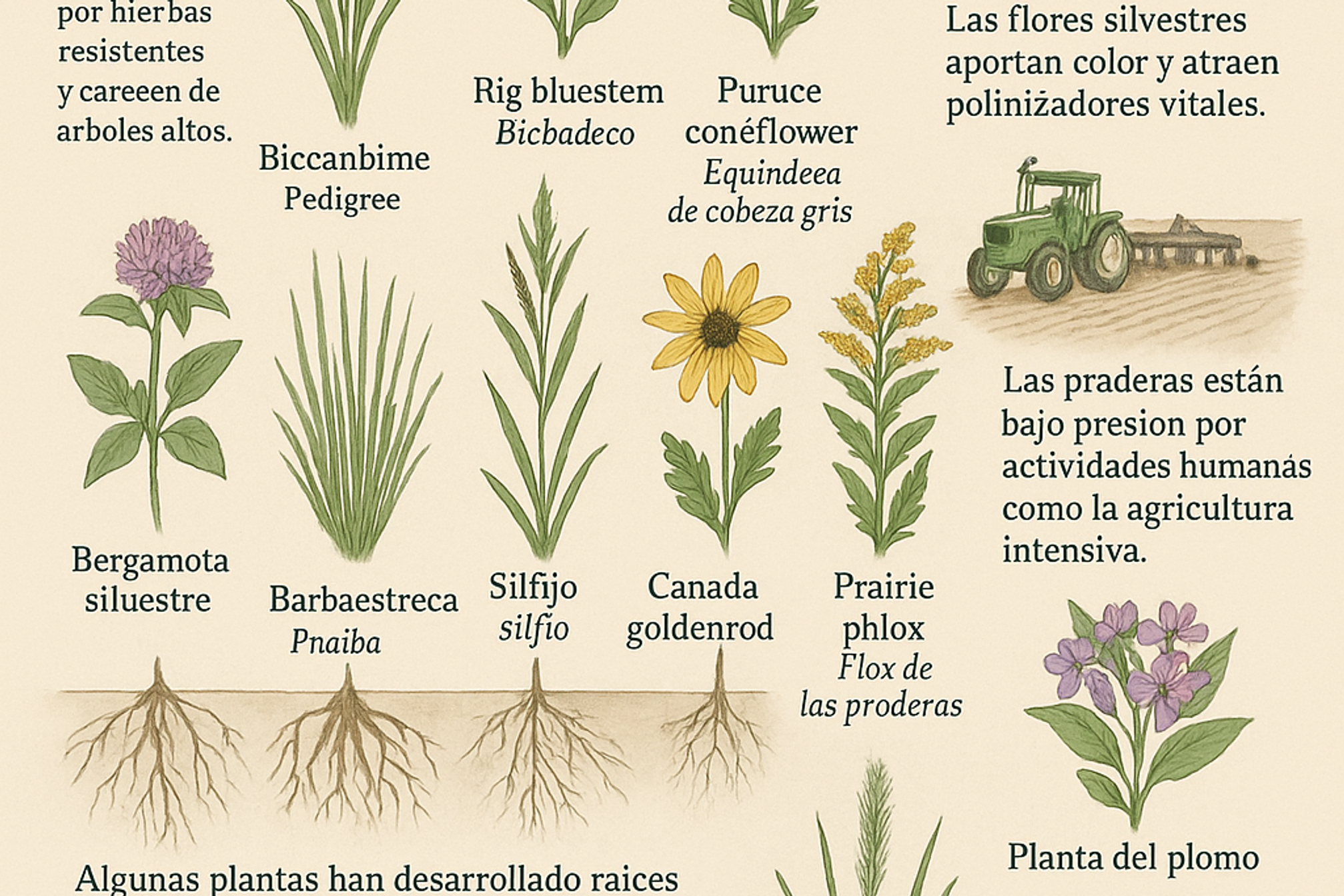 Las praderas son hogar de una gran diversidad vegetal, aunque muchas veces pasen desapercibidas frente a bosques o selvas. Cada especie mencionada cumple un papel único en el equilibrio ecológico: desde la fijación de nutrientes hasta el refugio para la fauna y la protección contra la erosión.