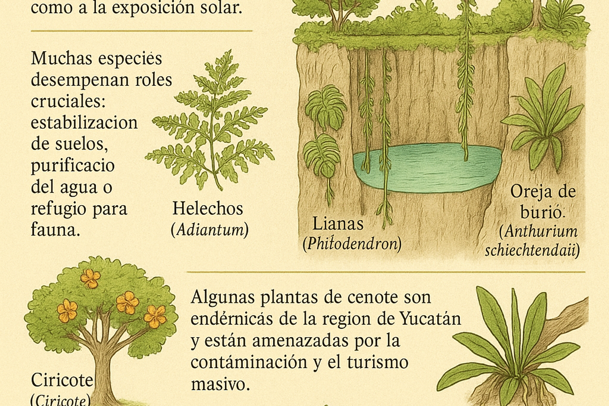 - Sus raíces filtran agua superficial y estabilizan las orillas del cenote.