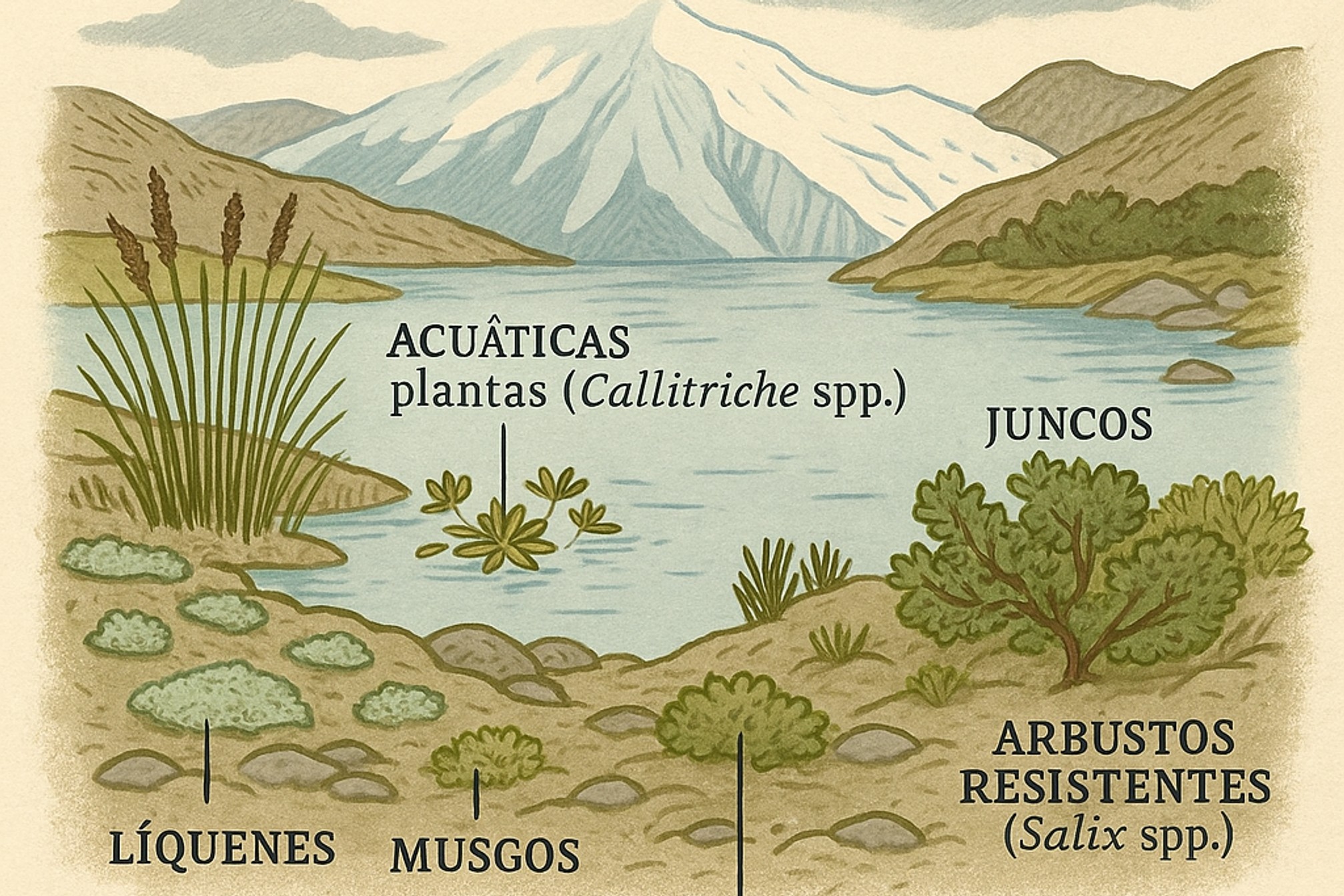 - Se destacan plantas acuáticas, juncos, líquenes, musgos y arbustos resistentes.