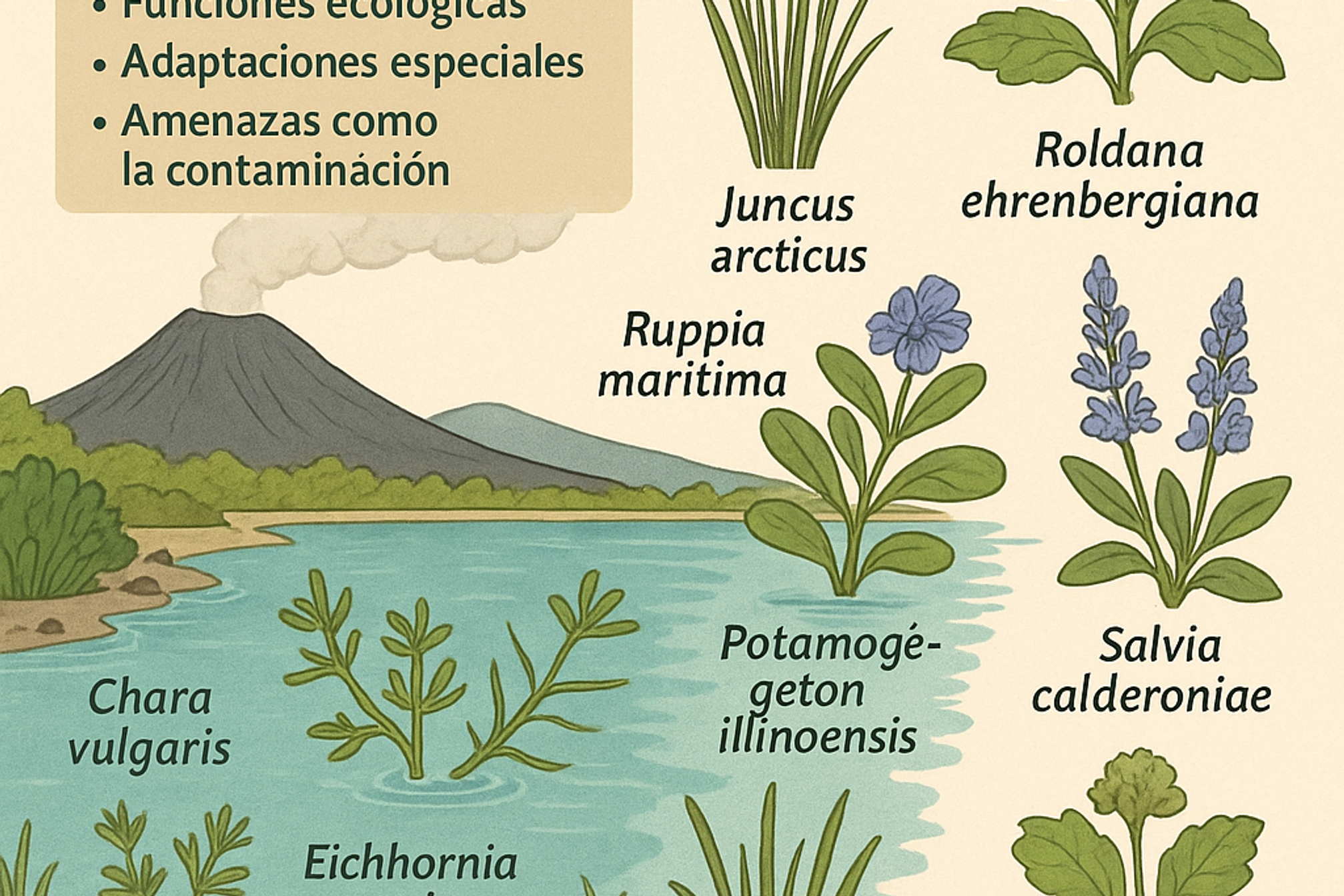 - Presenta epecies vegetales clave adaptadas al ambiente de lagos volcánicos.
