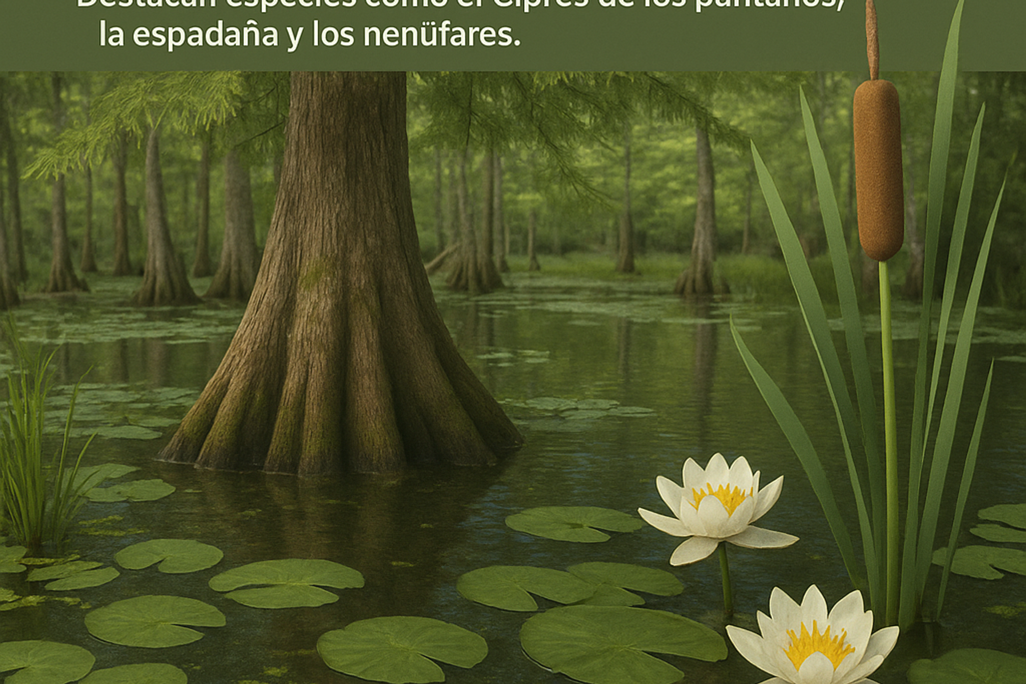 - Destacan especies como el Ciprés de los pantanos, la espadaña y los nenúfares.