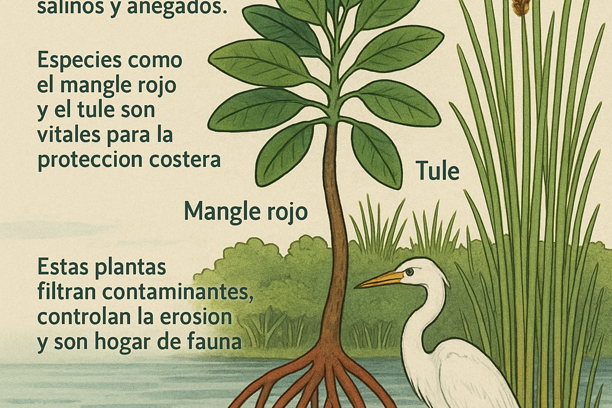 - Especies como el mangle rojo y el tule son vitales para la protección costera.