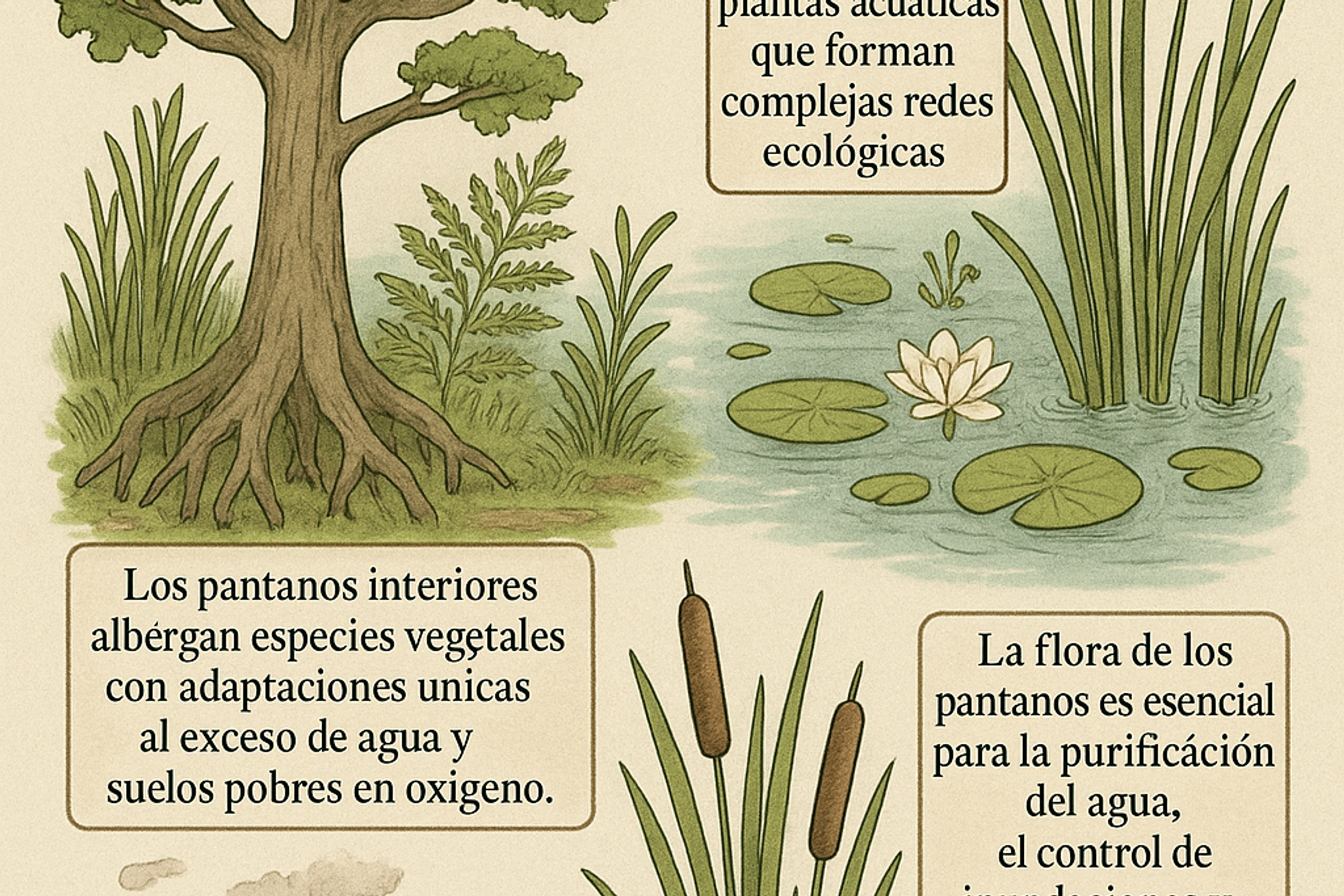 - Los pantanos interiores albergan especies vegetales con adaptaciones únicas al exceso de agua y suelos pobres en oxígeno.