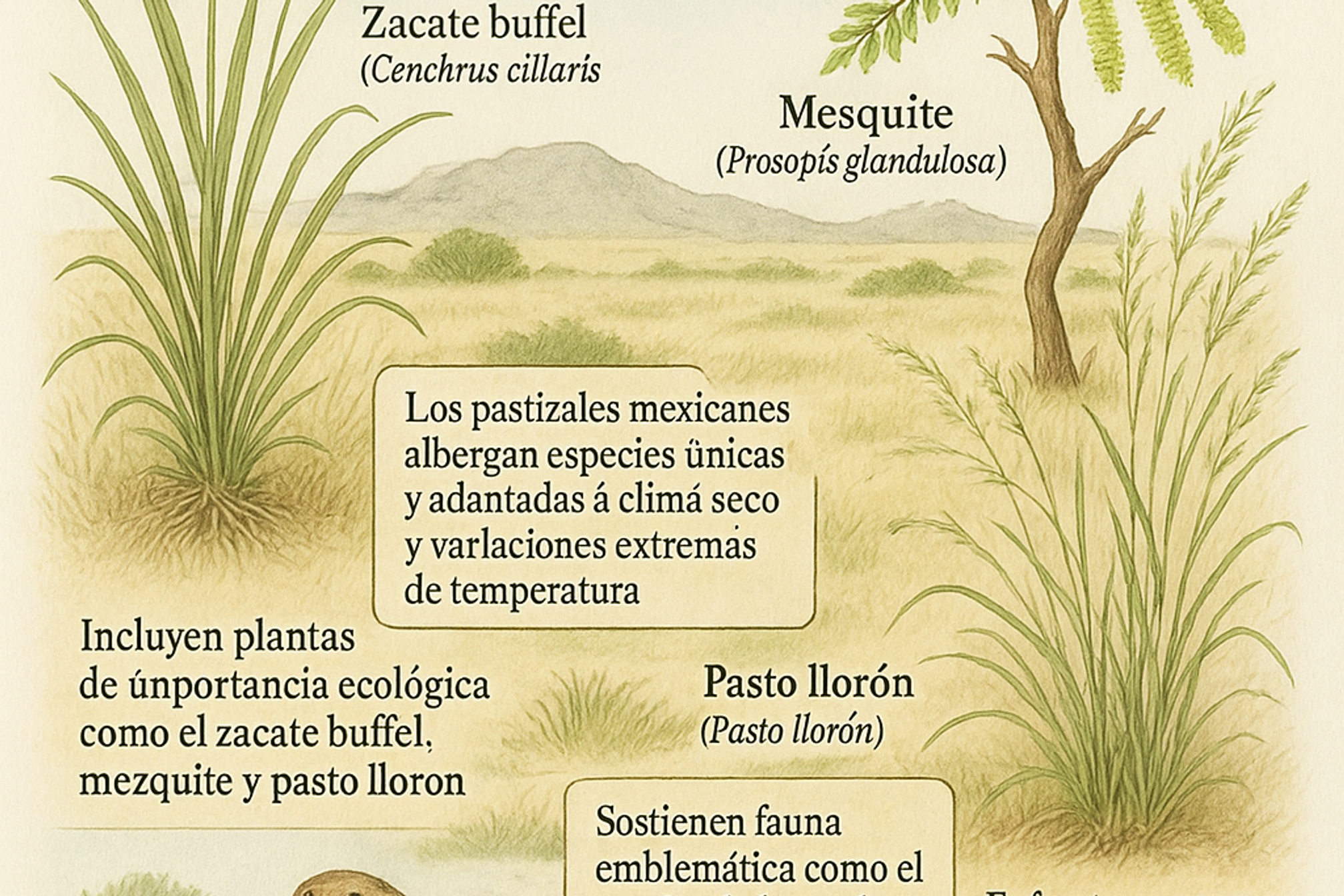 - Los pastizales mexicanos albergan especies únicas y adaptadas a clima seco y variaciones extremas de temperatura.