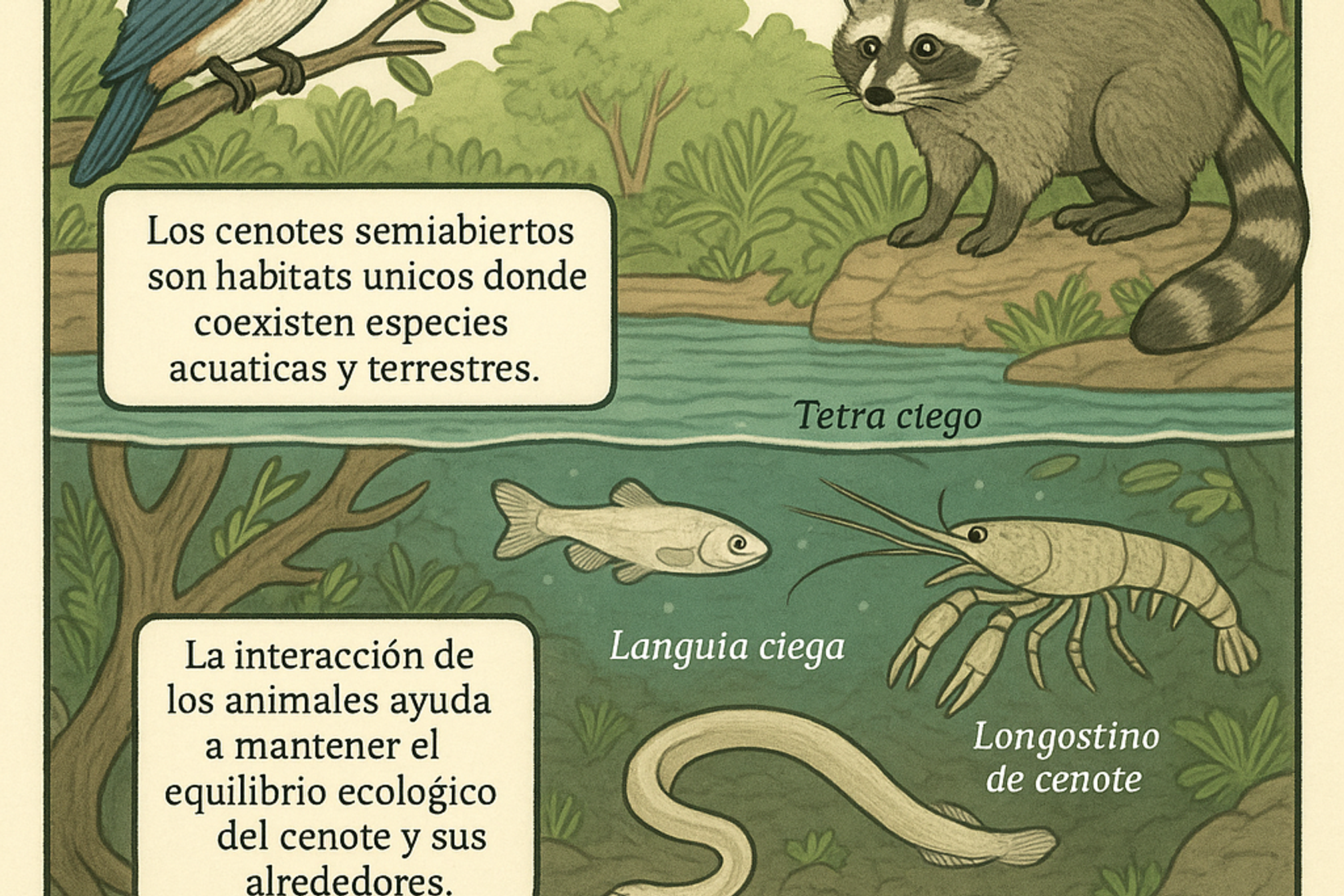 Los cenotes semiabiertos, joyas acuáticas de la península de Yucatán, albergan una fauna fascinante y adaptada a condiciones únicas que combina la exuberancia de la selva circundante con la singularidad de sus aguas. Descubre los principales animales que dependen de este delicado ecosistema.