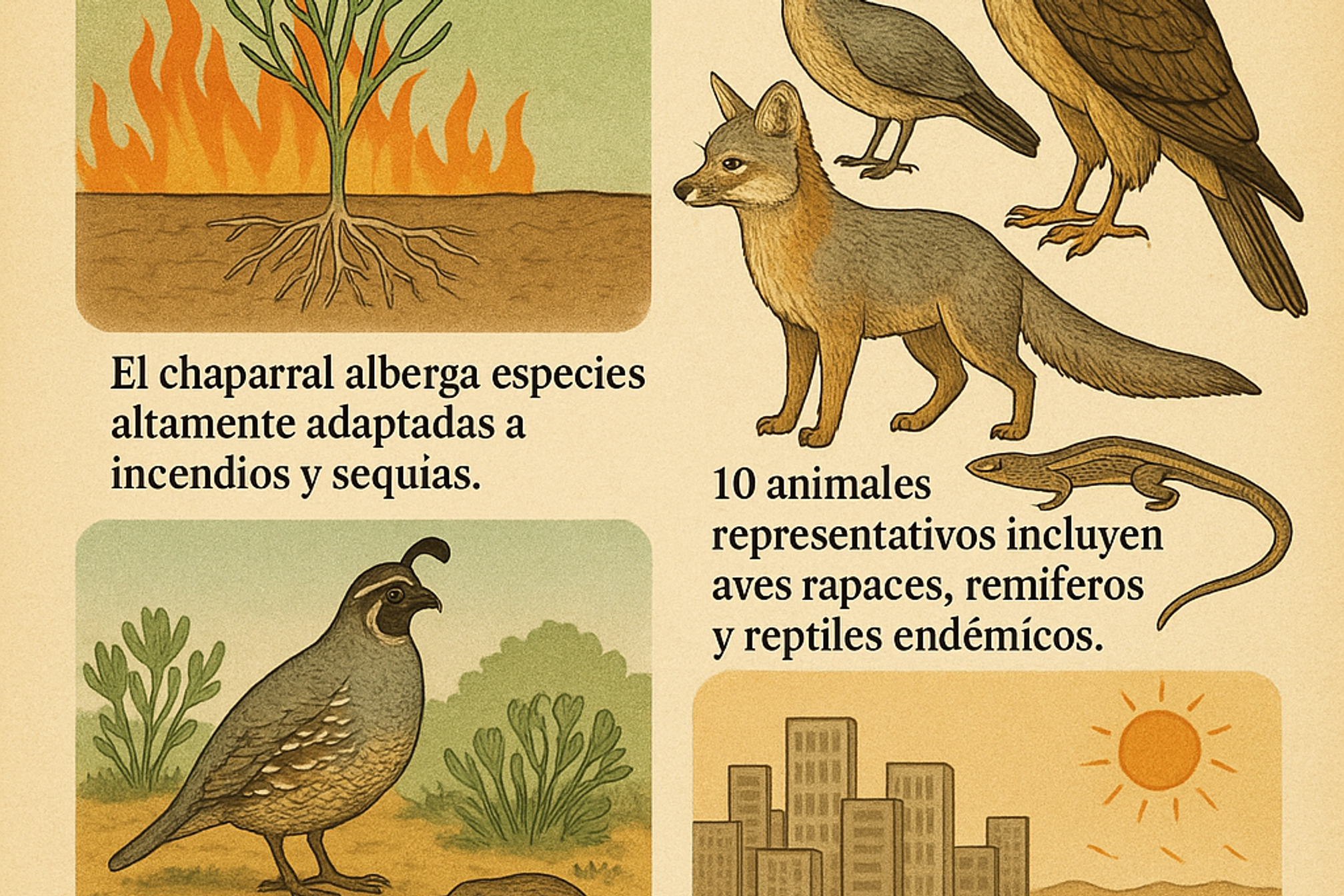 - El chaparral alberga especies altamente adaptadas a incendios y sequías.