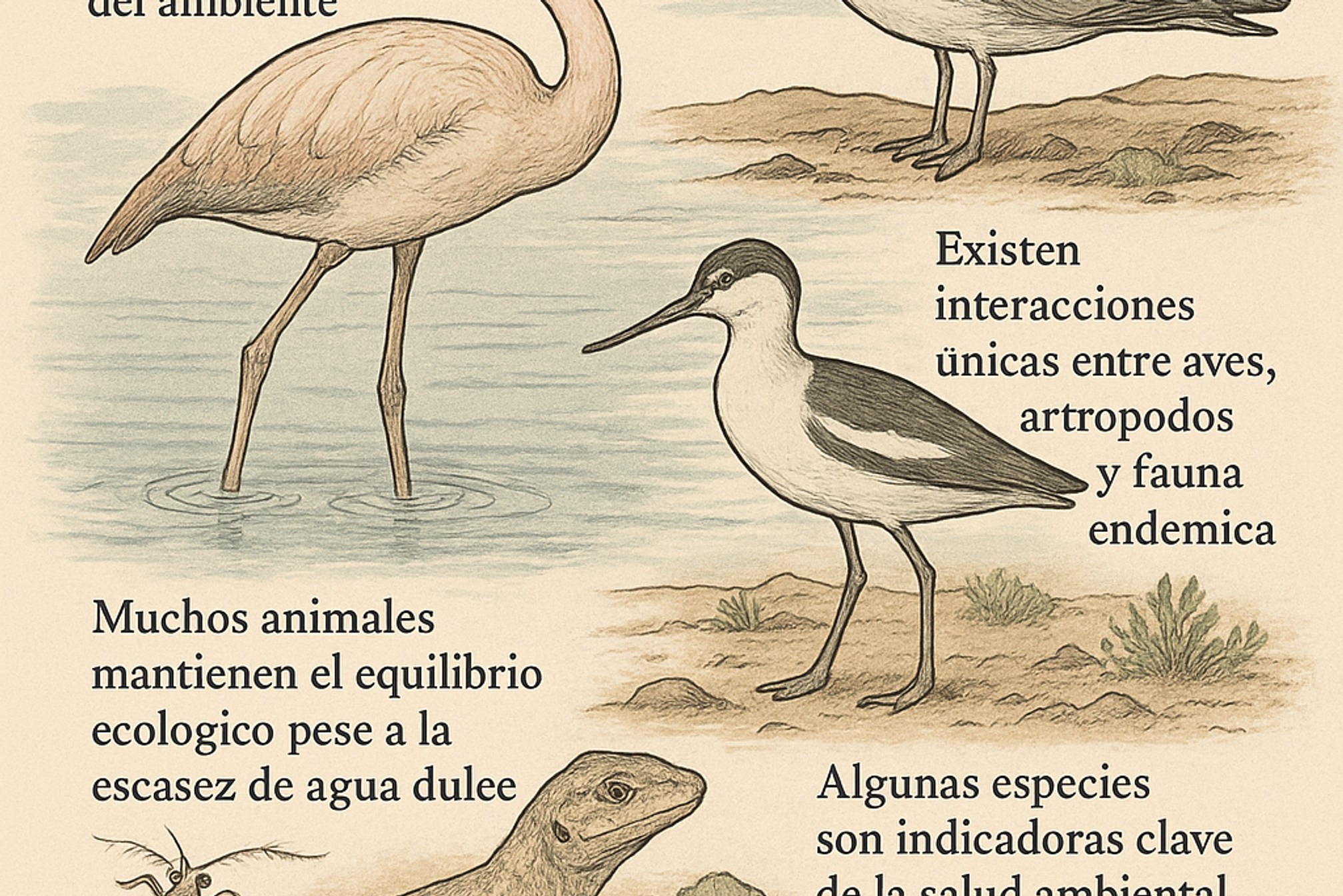 - Algunas especies son indicadoras clave de la salud ambiental del salar.