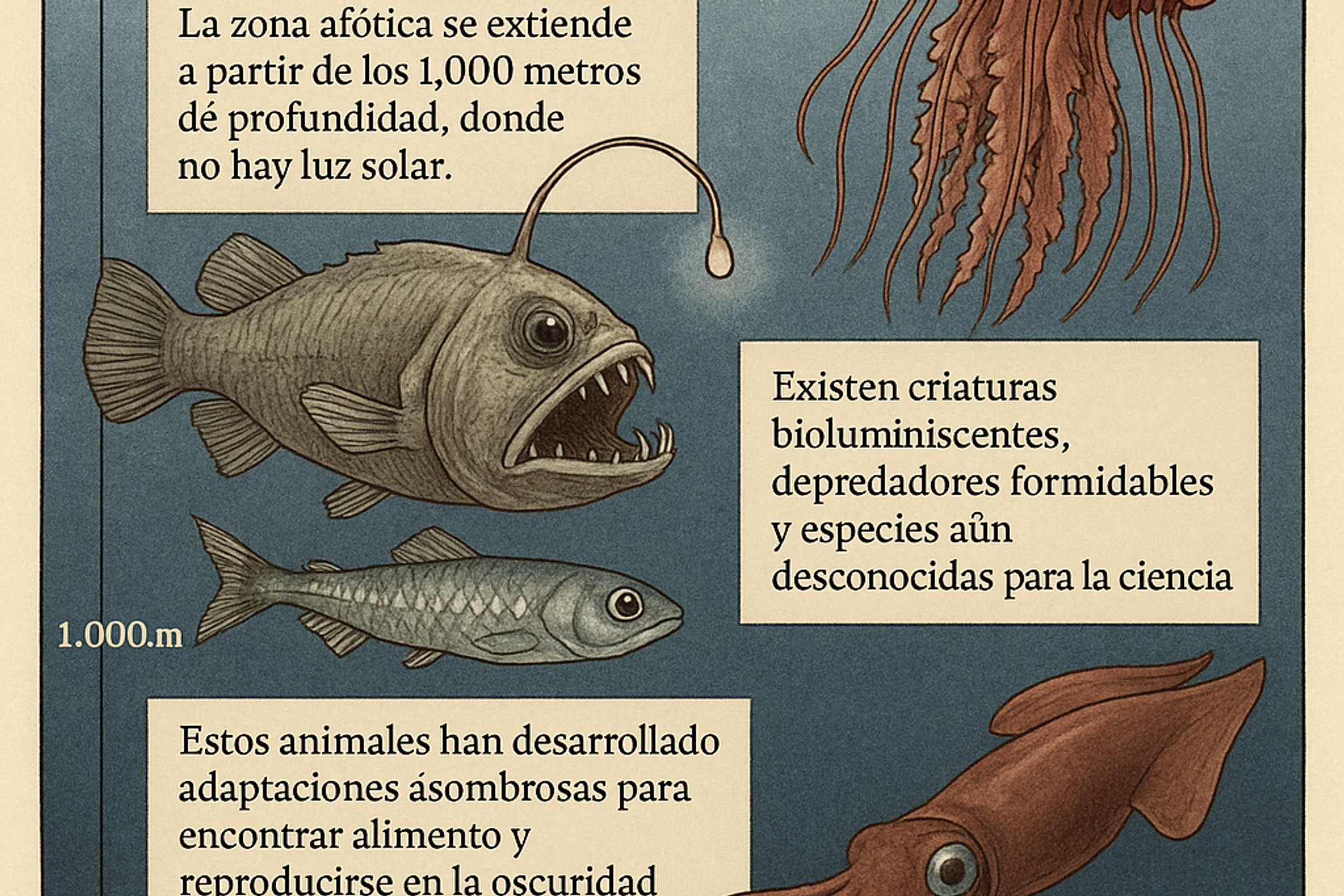 La zona afótica es una región del océano aún llena de enigmas y maravillas. Los animales que habitan en este mundo oscuro son un excelente ejemplo de la extrema adaptabilidad de la vida, con estrategias asombrosas para sobrevivir, alimentarse y reproducirse donde la luz no existe.