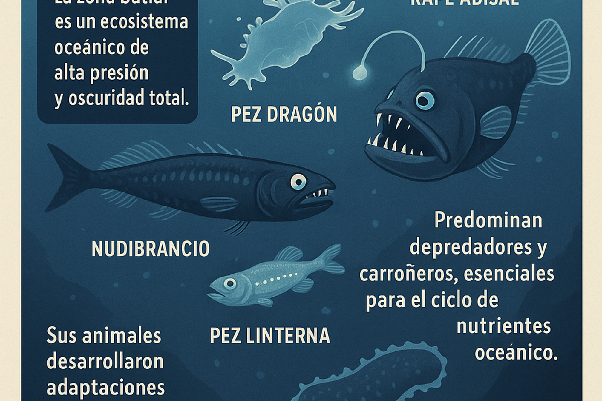La zona batial es uno de los ecosistemas más fascinantes y extremos del planeta, hogar de una fauna extraordinariamente diversa y adaptada a condiciones de alta presión, ausencia de luz y recursos escasos.