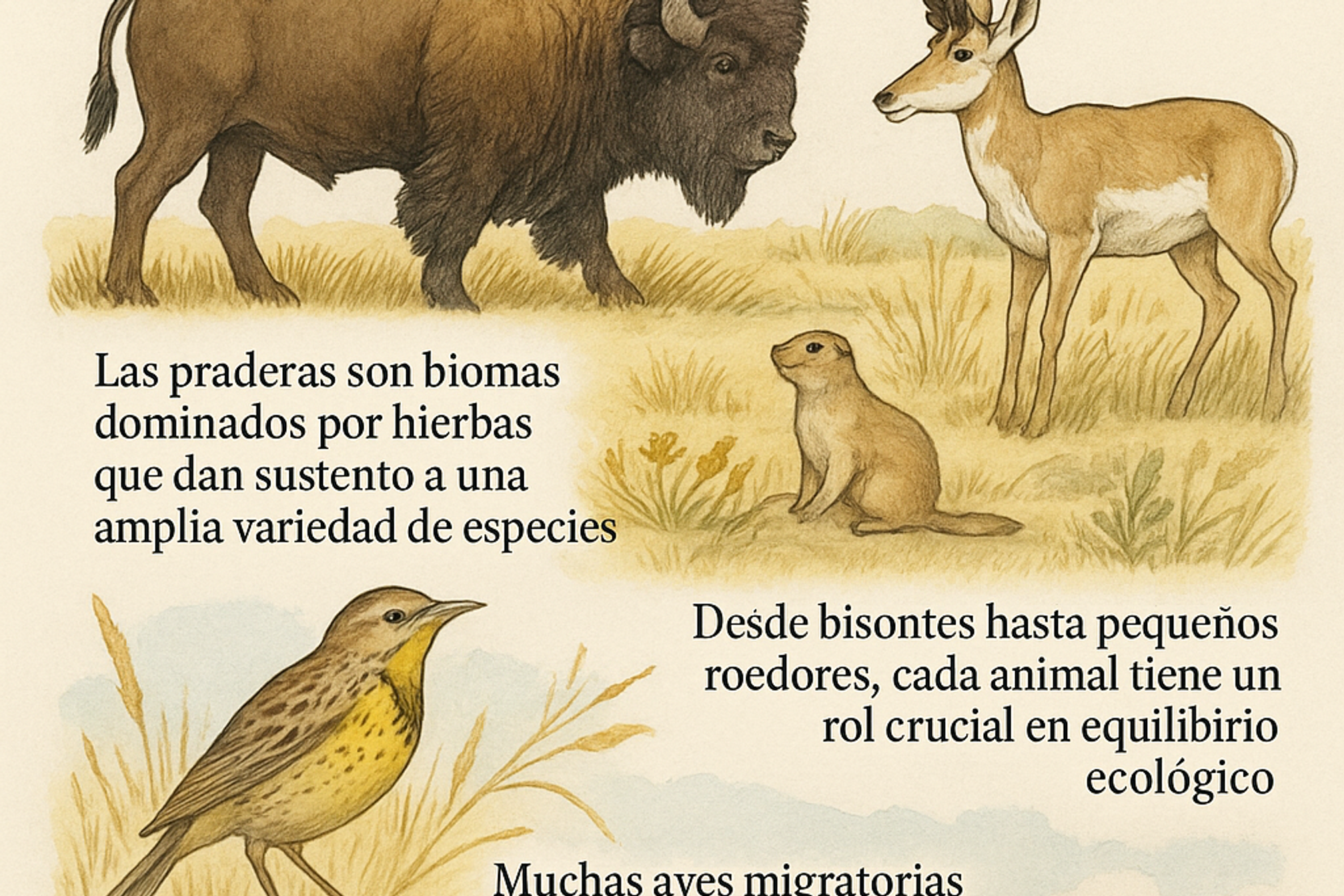 - Las praderas son biomas dominados por hierbas que dan sustento a una amplia variedad de especies.