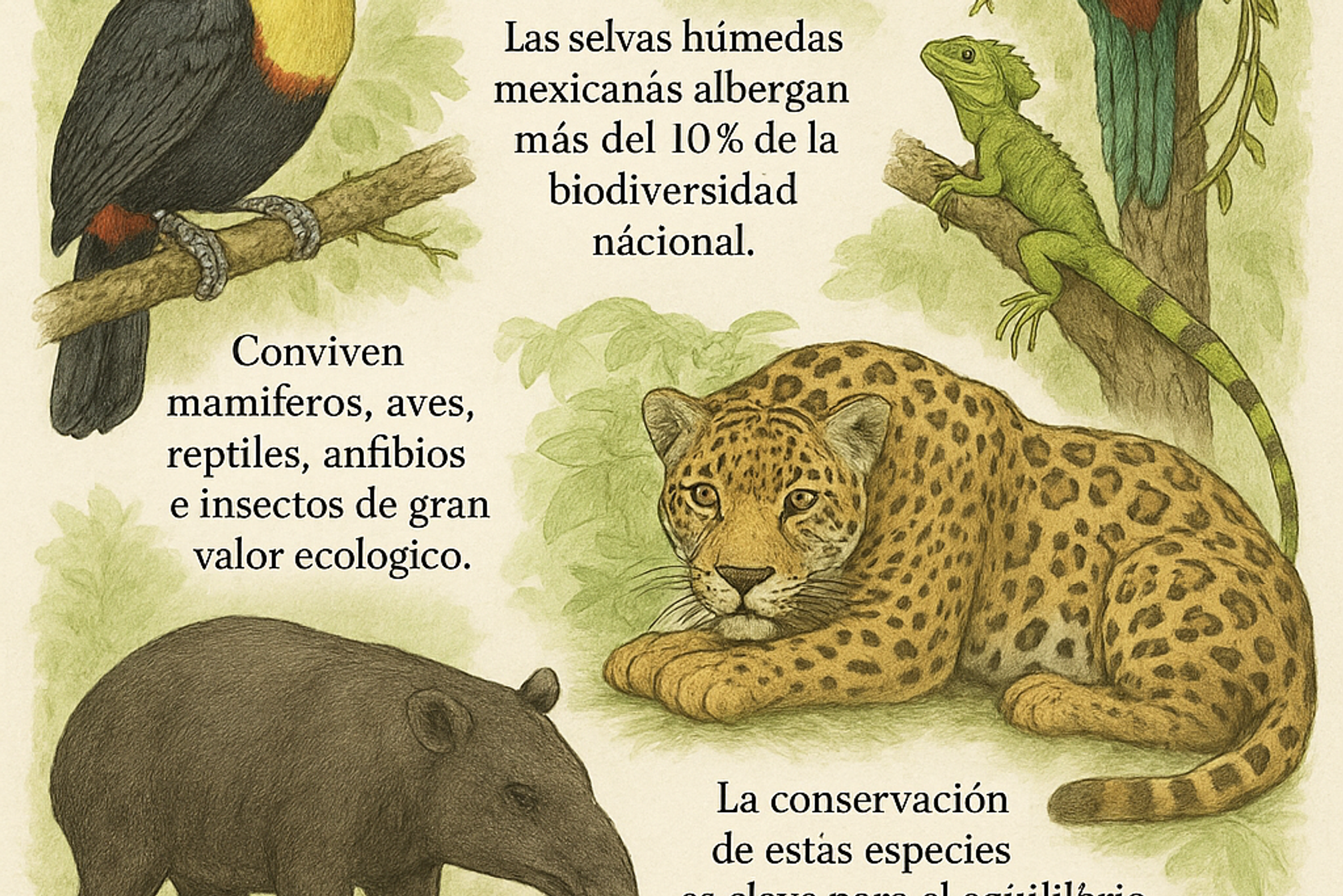 La selva húmeda mexicana es el refugio de una biodiversidad impresionante y frágil. Cada especie cumple un papel irremplazable, desde la dispersión de semillas hasta el control de poblaciones y el reciclaje de nutrientes.