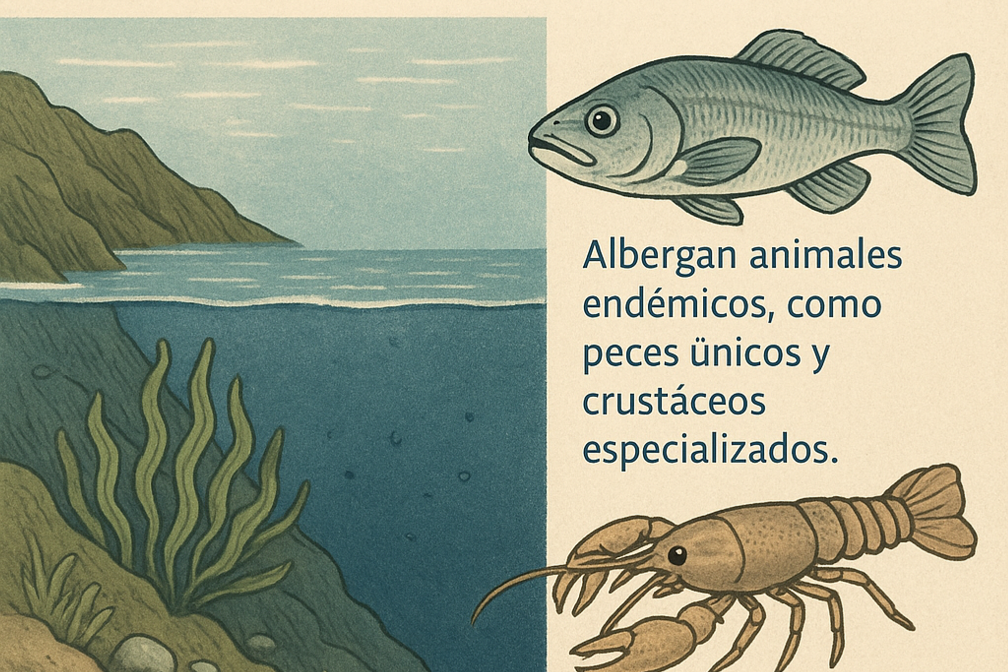 - Albergan animales endémicos, como peces únicos y crustáceos especializados.