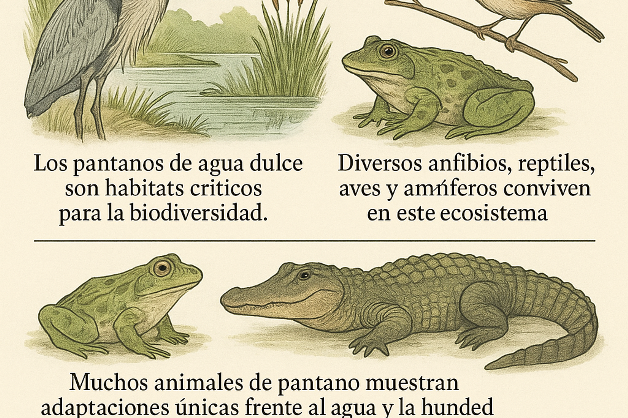 Los pantanos de agua dulce albergan una diversidad de animales perfectamente adaptados a un ambiente húmedo y cambiante, incluyendo anfibios, reptiles, aves y mamíferos que juegan roles fundamentales en el ecosistema.