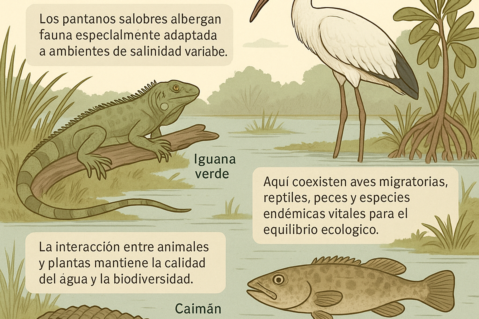 - Los pantanos salobre albergan fauna especialmente adaptada a ambientes de salinidad variable.