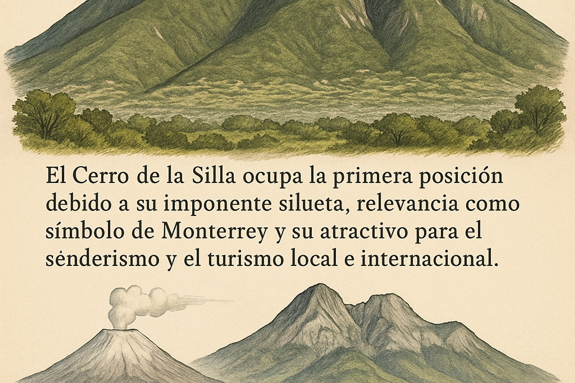 - El Cerro de la Silla ocupa la primera posición debido a su imponente silueta, relevancia como símbolo de Monterrey y su atractivo para el senderismo y el turismo local e internacional.
