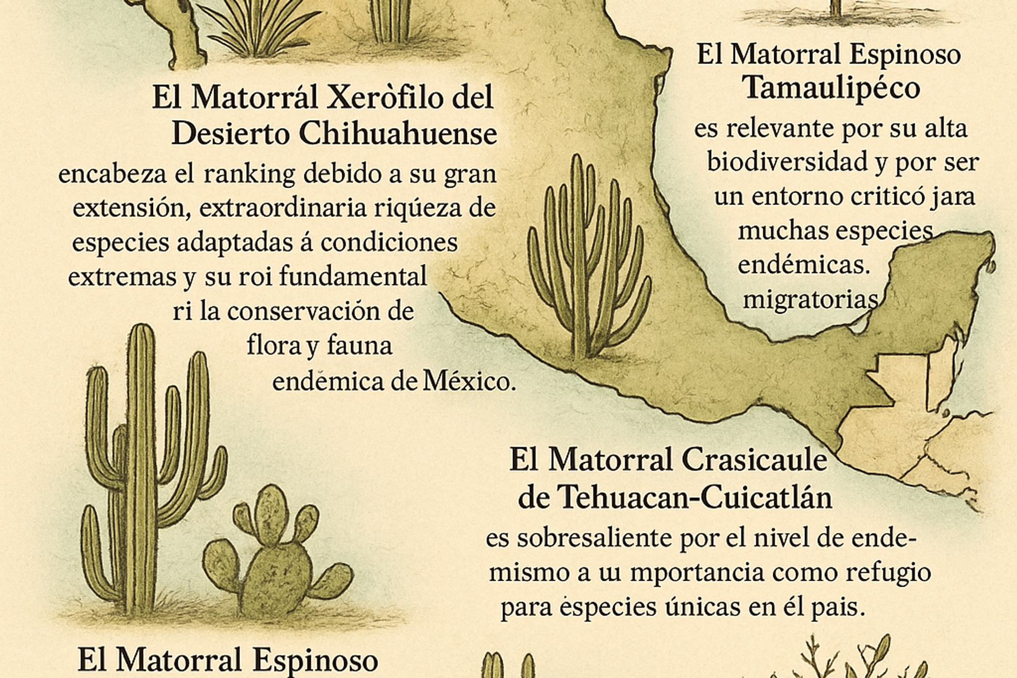 - El Matorral Xerófilo del Desierto Chihuahuense encabeza el ranking debido a su gran extensión, extraordinaria riqueza de especies adaptadas a condiciones extremas y su rol fundamental en la conservación de flora y fauna endémica de México.