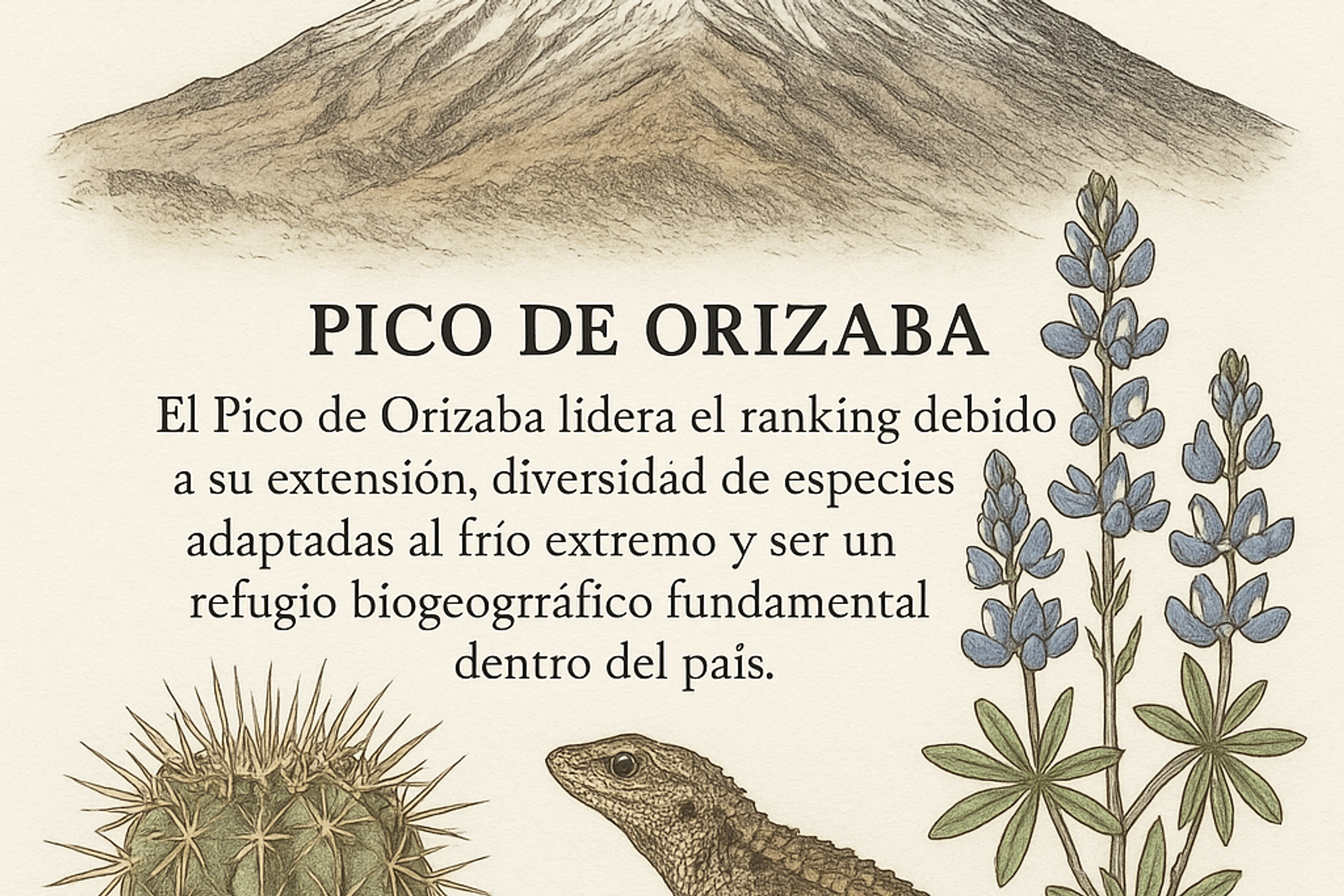 - El Pico de Orizaba lidera el ranking debido a su extensión, diversidad de especies adaptadas al frío extremo y ser un refugio biogeográfico fundamental dentro del país.