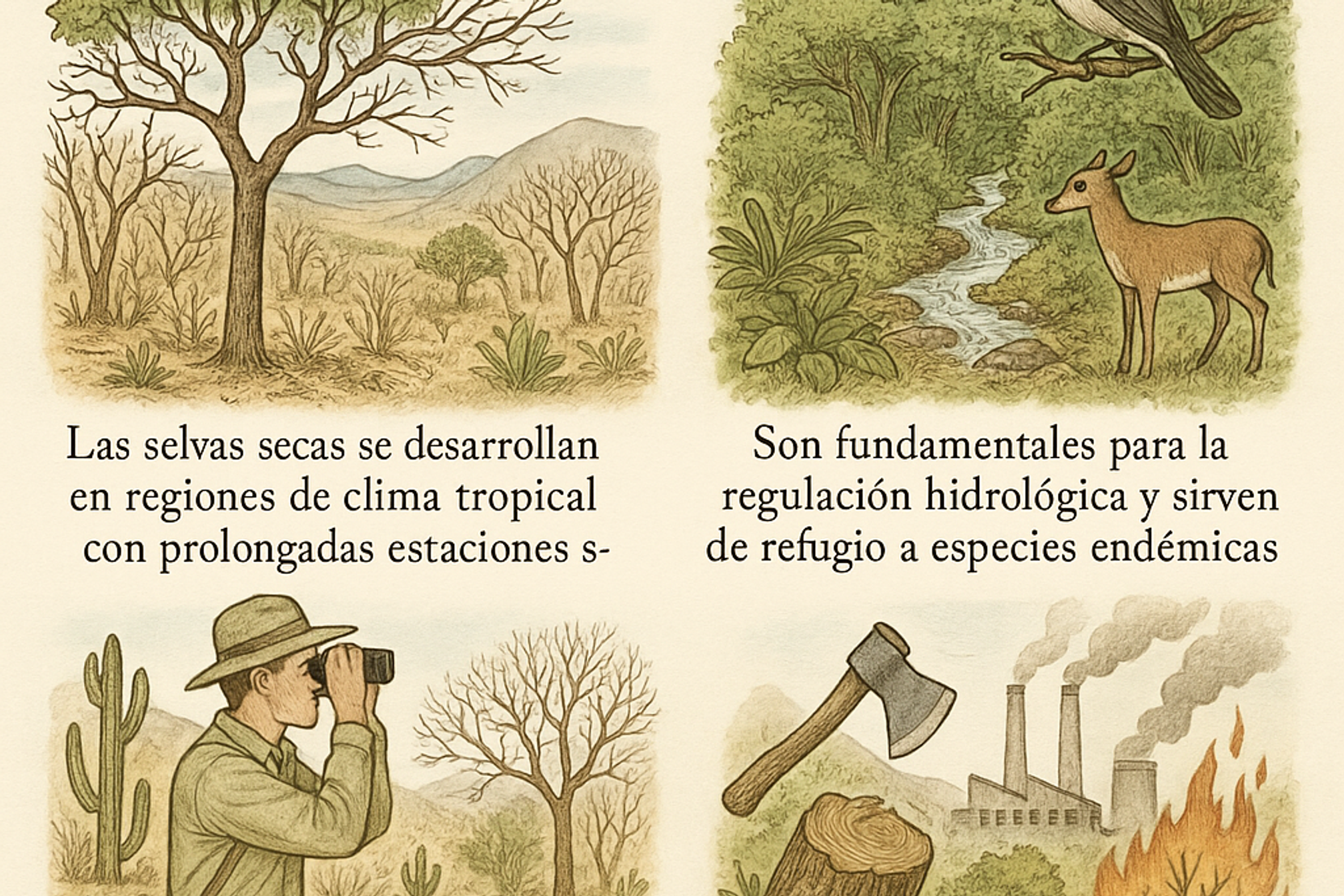 La selva seca representa uno de los ecosistemas más fascinantes y amenazados del planeta. Lo aprendido nos recuerda la importancia de la interdependencia entre el clima, el suelo, la flora y la fauna, y cómo cada elemento cumple un papel esencial en el funcionamiento de este complejo entorno.
