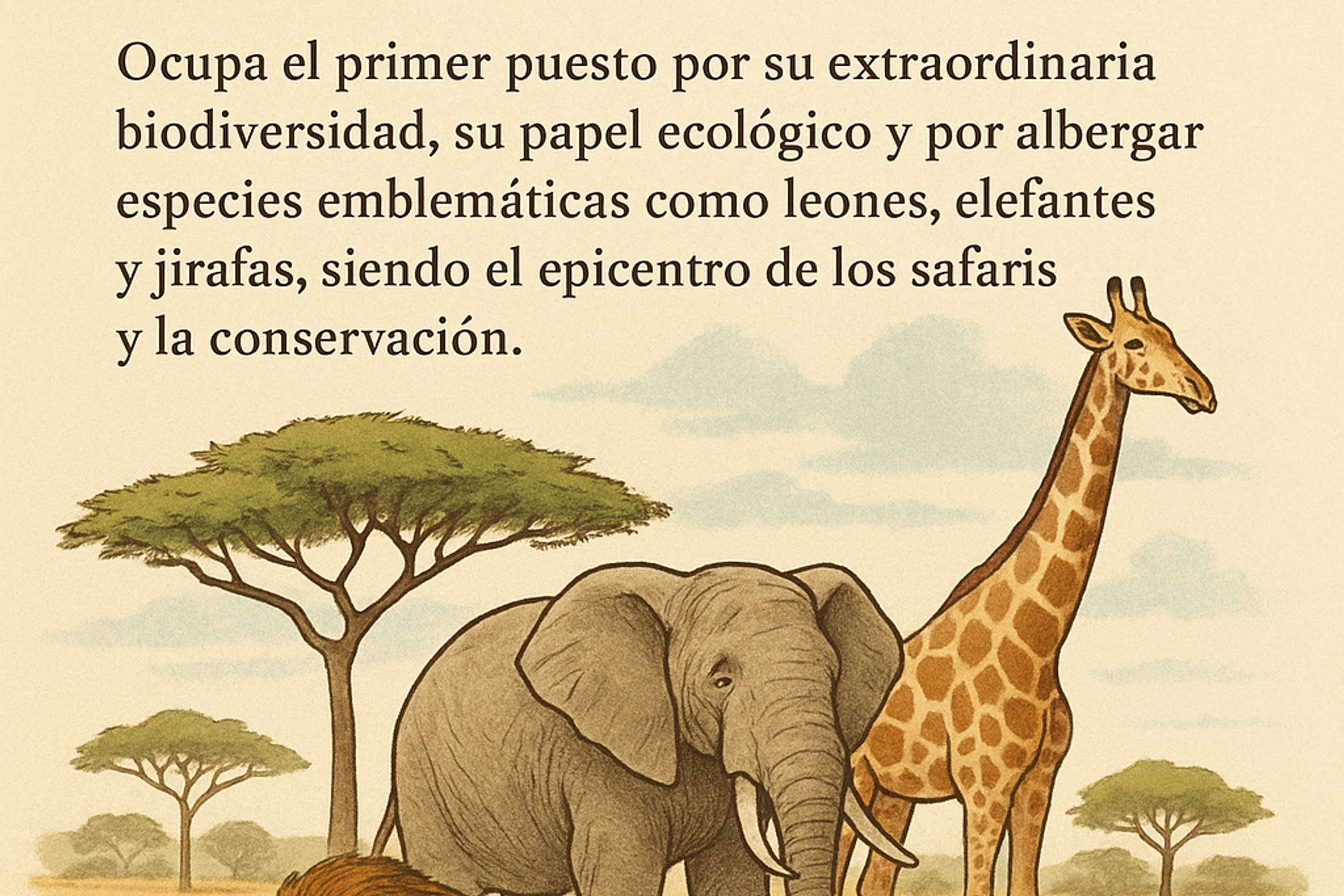 - La Sabana Africana ocupa el primer puesto por su extraordinaria biodiversidad, su papel ecológico y por albergar especies emblemáticas como leones, elefantes y jirafas, siendo el epicentro de los safaris y la conservación.